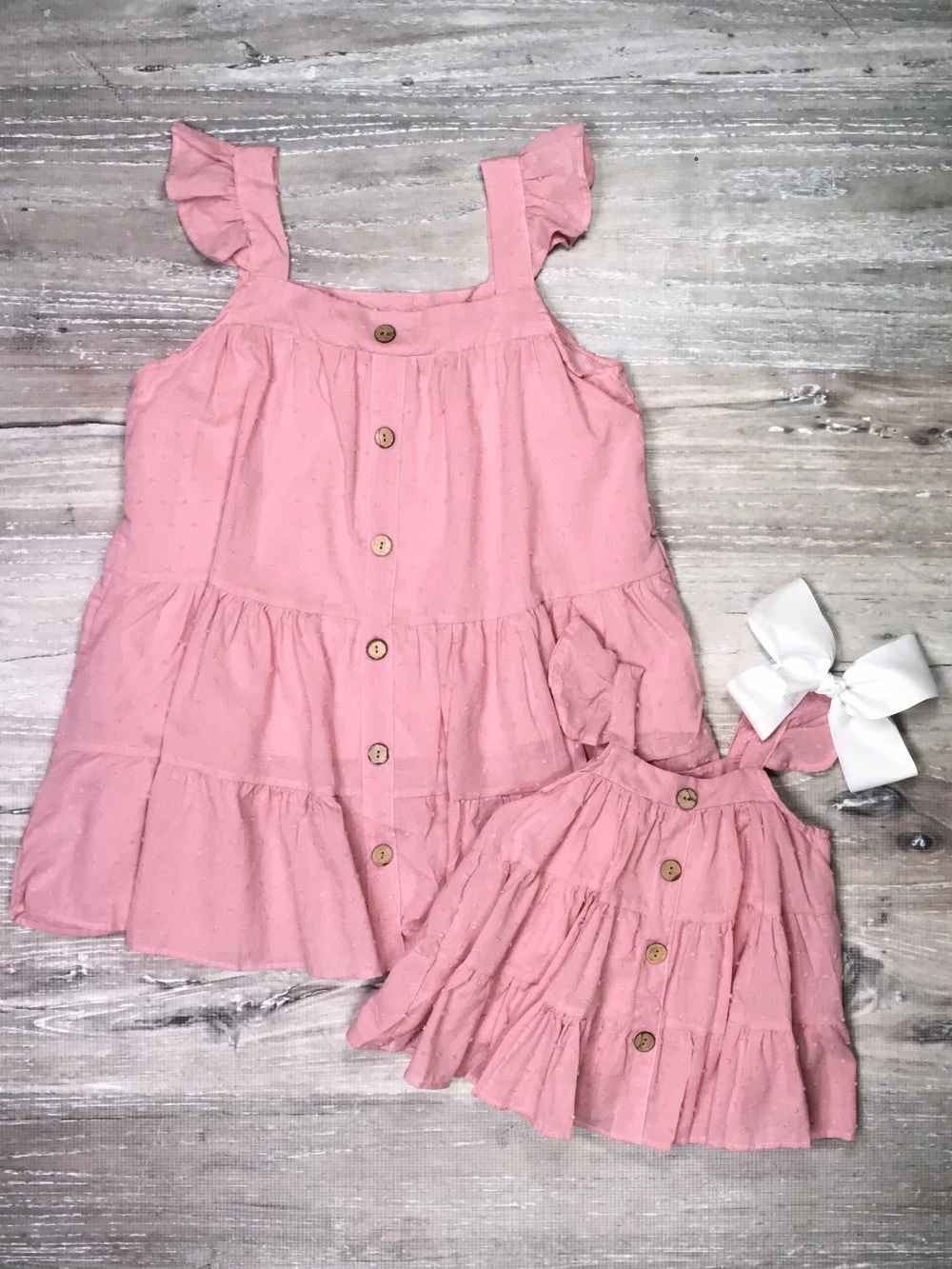 Look beautiful in blush with our Mommy and Me – Blush Pink Swiss Dot Baby Doll Matching Tank Tops! The enchanting blush pink sleeveless top features swiss dot detailing, buttons, and flutter sleeves. This stylish shirt is perfect for vacations, family photos, dinner parties, shopping trips, mommy and me dates, and so much more. Just pair the top with some classic white jeans or casual denim shorts and you’ll be ready to take on the day in style. Pick up a top for you and for your little fashionista while you still can. Make sure that you also checkout our other essential mommy and me tops and outfits.
