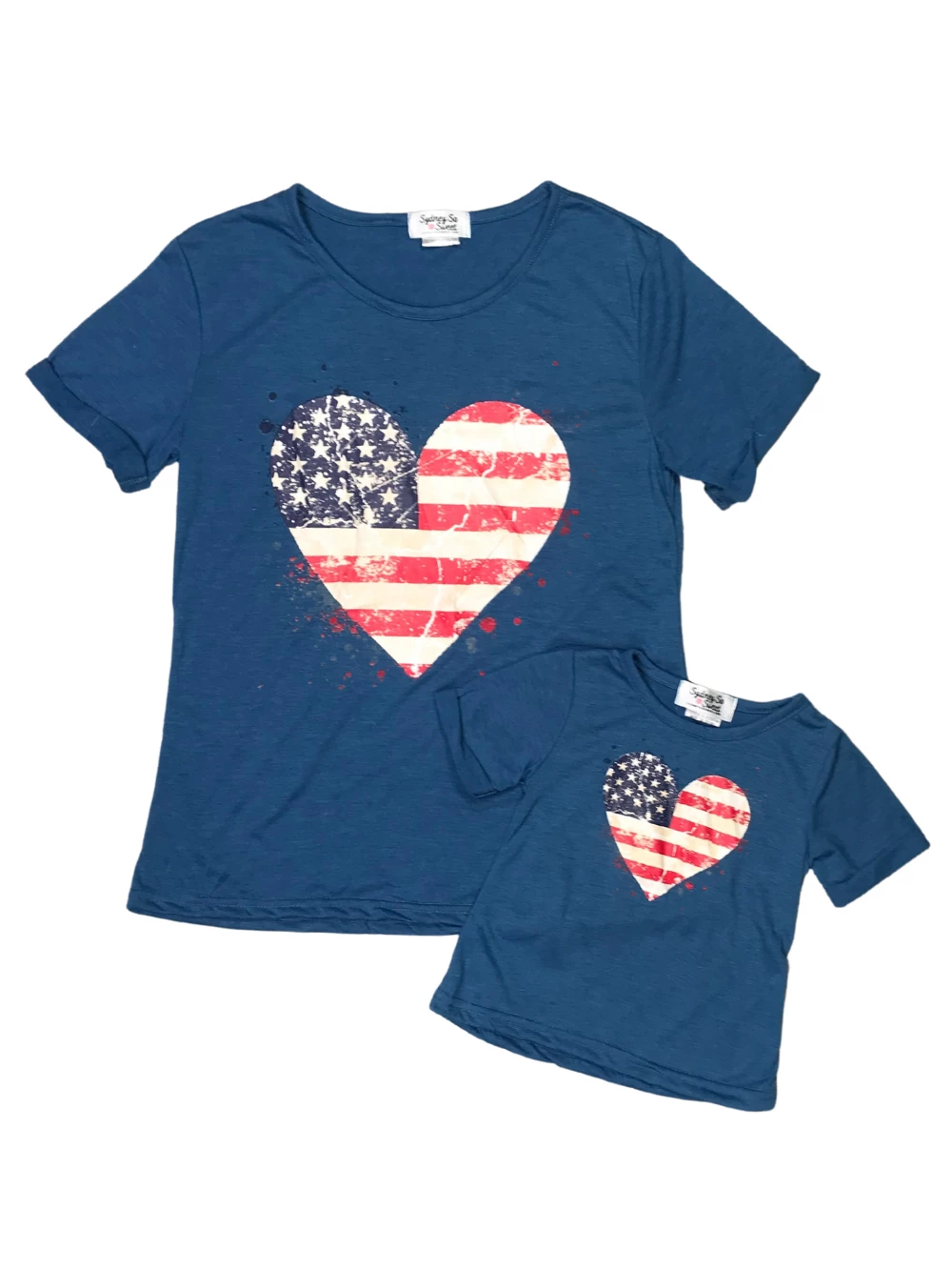 Stock up on the essentials with our all American Mommy and Me – American Flag Heart Blue Matching Patriotic Tops! The adorable blue short sleeve top features an American flag patterned heart detail. We are loving this shirt with some denim shorts, leggings, or thrown over a bathing suit. The t-shirt is perfect for picnics, family parties, watching fireworks, playdates, running errands, and so much more. Bring out your patriotic side and add these shirts to your cart while they’re still in stock and be sure to take a look at our other fashion forward mommy and me pieces.