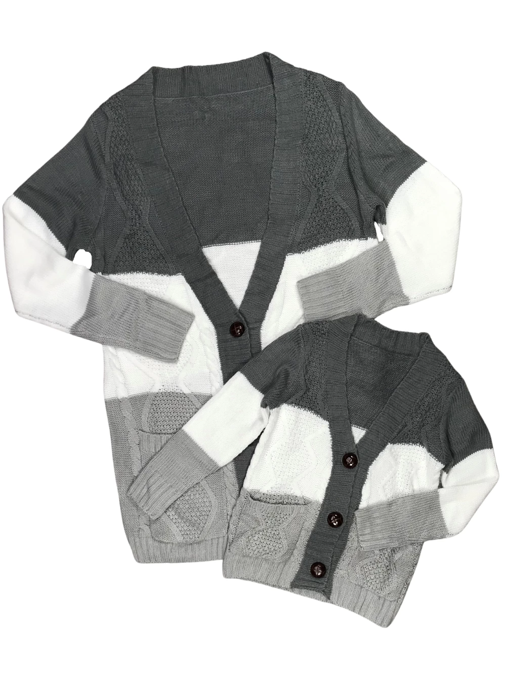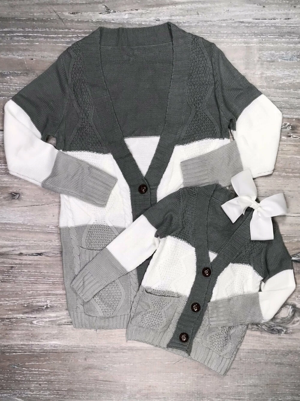 Alexa play, Cardigan by Taylor Swift while we wear our Mom & Me – Gray Stripe Button Up Cardigan Sweater! The long sleeve cardigan sweaters feature a gray and white striped pattern, pockets, and large brown buttons. The cardigans are literally the coziest and softest sweaters that we’ve ever felt! We are loving the cardigans with a simple tank, a graphic tee, or a cute blouse. The cardigans are perfect to just throw on over top of whatever outfit you’re already wearing! You and your little can wear the sweaters to school, work, running errands, football games, photoshoots, parties, playdates, and so much more! Keep warm in style and add these staple sweaters to your cart and make sure that you checkout our other cozy essentials.