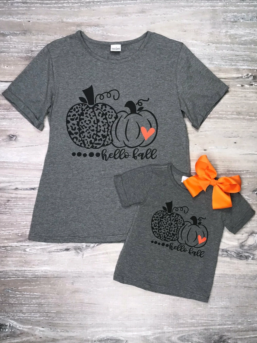 Say hello to fall with our fashion forward Mom & Me – Hello Fall Pumpkin Gray Short Sleeve T-Shirt! The super cute gray short sleeve top features a pumpkin detail, the phrase “Hello Fall,” and cuffed detailing on the sleeves. We are just loving the neutral gray color as it makes it super easy to mix and match with other pieces that you or your little already own. The shirts are perfect for playdates, running errands, shopping trips, going to the pumpkin patch, and so much more! Just pair the tops with some cozy pants and a cute pair of sneakers and you’ll be ready to welcome in the new season. Add the tops to your collection and checkout our other mommy and me best sellers.