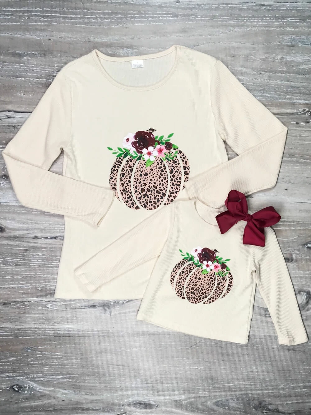 Every cold weather wardrobe needs a basic thermal top! Add onto your staple collection with our Mom & Me – Leopard Burgundy Floral Pumpkin Cream Thermal Top! The cozy cream long sleeve thermal top features a burgundy leopard patterned pumpkin detail that features floral trim. We are loving this cozy and cute top with some denim jeans, leggings, or a simple pair of joggers. The shirt is perfect for school, running errands, picking up your pumpkin flavored favorites, and so much more! Pick up this staple shirt for you and your little and checkout our other must have mommy and me long sleeve shirts!