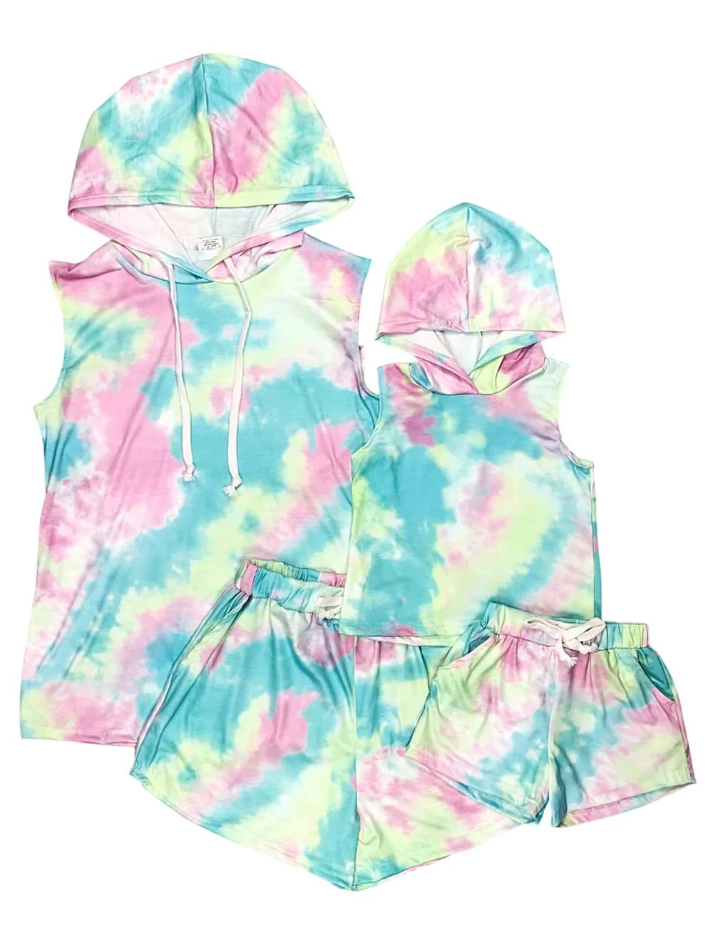 Add some color to your lazy day with our vibrant Mom and Me – Pastel Tie Dye Hooded Tank Shorts Sets. The stylish set comes with a pastel tie dye patterned tank top that includes a hood and drawstrings. The set also comes with a pair of coordinating pastel tie dye elastic shorts. You and your little can pair these sets with your favorite pair of sneakers or with a pair of our cozy and luxurious slippers. The shorts sets are perfect for lazy days at home, running errands, coffee dates, work outs, vacations, and so much more! Add one for you and one for your little to your cart while they’re still available!