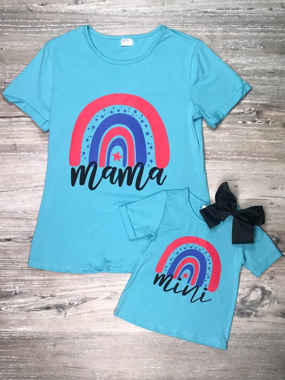 Celebrate freedom with our patriotic Mom and Me – Red White & Blue Mama and Mini Tops. The vibrant blue short sleeve tops include a bohemian red, white, and blue rainbow detail as well as the words “Mama” and “Mini.” We are loving these tops with jeans, leggings, or shorts. The tops are perfect for parties, picnics, cookouts, running errands, watching fireworks, and so much more! The patriotic colors are just so perfect for all of those upcoming holidays. Hurry up and add the tops to your cart before they’re all gone and checkout our other best selling mommy and me patriotic tops.