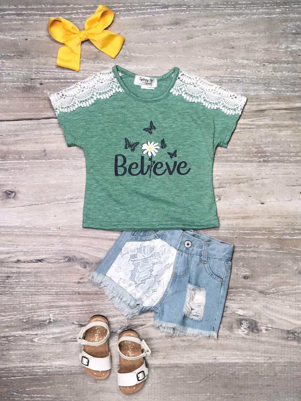 Believe in the endless possibilities of fun with our cutest Believe Butterfly Green Lace Denim Girls Shorts Outfit! The adorable set comes with a a sage green short sleeved top that features the phrase: “Believe” underlining a flower and some butterflies, and styles cute lace detailing along the shoulders. The top is styled with a pair of coordinating denim shorts which feature a distressed look paired with a large lace patch on one leg. We are absolutely loving the lace theme of this outfit, it is so stylish this season! Your little cutie can pair this set with some sandals and a cute hair accessory. This outfit is perfect for a shopping trip, vacation, dinner, and so much more! Embrace the season of butterflies and order this adorable set now!