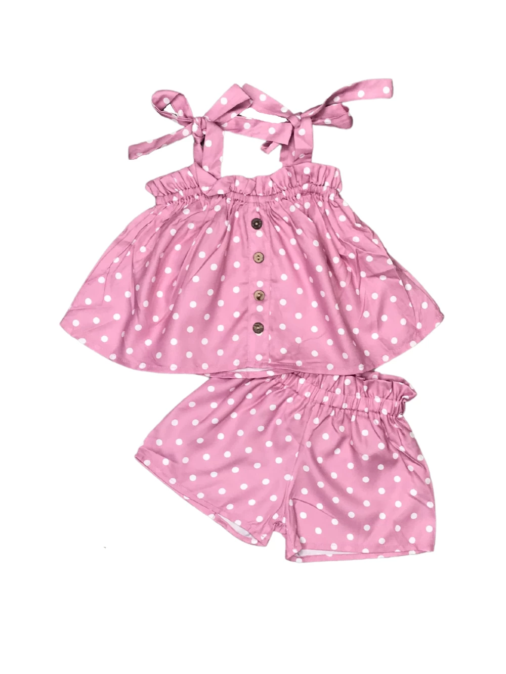 Keep your beauty blushing in our Blush Pink Polka Tie Strap Ruffle Girls Shorts Outfit! The super cute set comes with a pink sleeveless top that features a white polka dot pattern, tie straps, and button details. The set also comes with a pair of coordinating pink shorts that feature a polka dot pattern and elastic waistband. We are loving this staple set with some classic white sandals and a coordinating white hair bow. The outfit is perfect for running errands, playdates, parties, and so much more. Pick up this outfit and be sure to checkout our other staple shorts sets.