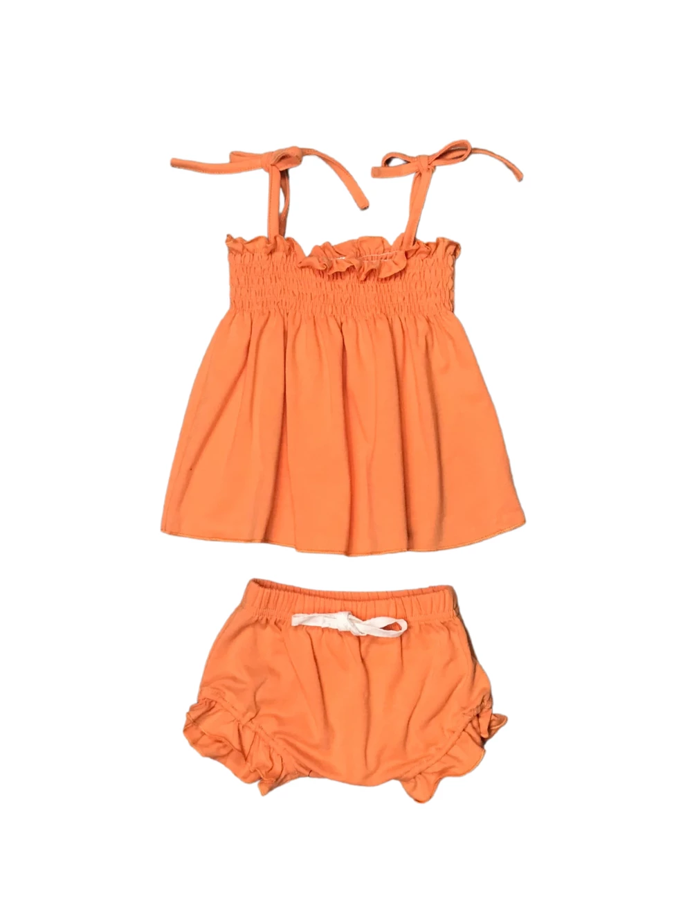 Brighten up her spring and summer wardrobe with our Creamsicle Orange Smocked Flutter Baby Girls Outfit! The set comes with an orange top that features a smocked cut and tie straps. The set also comes with a pair of coordinating orange shorts that feature ruffle detailing, an elastic waistband, and tie drawstring. We are loving this outfit with some sneakers or sandals and a coordinating hair bow. The outfit is perfect for running errands, vacations, parties, and so much more! Pick up this staple set while her size is still in stock, girly! Don’t forget to checkout our other best selling baby outfits and pieces.