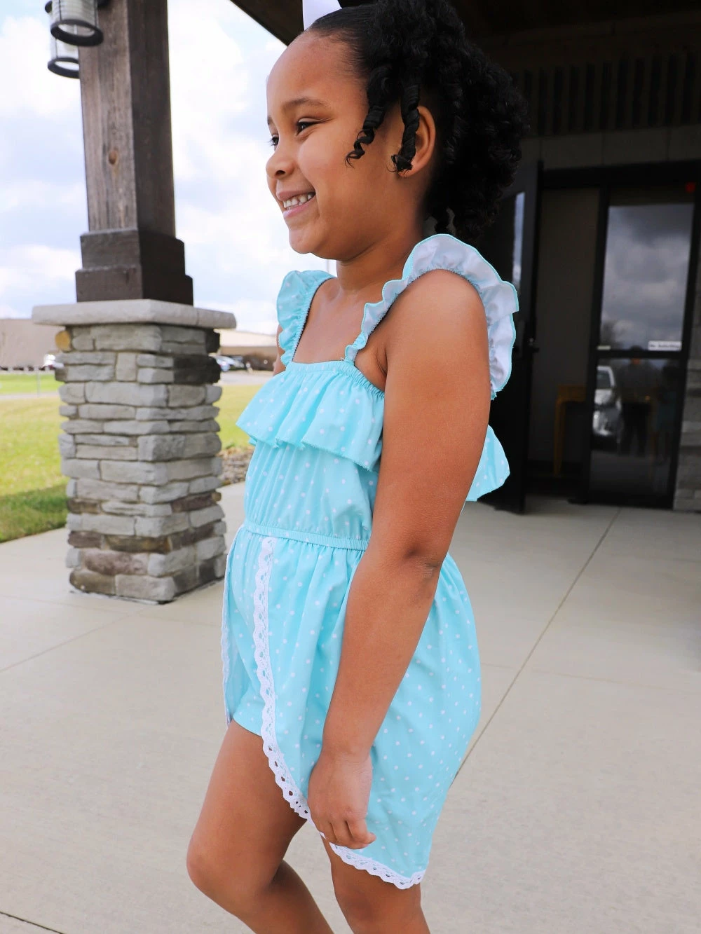 Be fashionable in our super trendy Light Blue & White Polka Dot Ruffle Flyaway Girls Shorts Romper! The blue shorts romper features a white polka dot pattern, a flyaway detail, scrunched trim, and a ruffle overlay. We are loving the trend setting romper with some sneakers or sandals and a coordinating white hair bow. The staple romper is perfect for vacations, parties, shopping trips, parties, running errands, and so much more. Be sure to snag up this romper while her size is still in stock and don’t forget to checkout our other fashionable favorites.Â