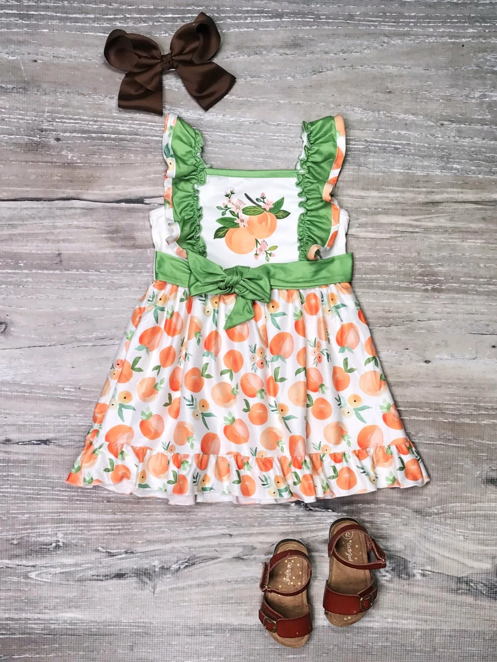Keep it peachy and perfect with our fashionable Peach Of My Heart Watercolor Green Ruffle Girls Tank Dress! The sleeveless dress features a watercolor peach pattern, green trim, ruffle detailing, and a coordinating green tie belt. We are loving this darling dress with some sneakers or sandals and a coordinating orange or green hair bow. The dress is perfect for vacations, picnics, running errands, family photoshoots, and so much more. Pick up this must have dress for your little cutie and be sure to take a look at our other best selling dresses and outfits.Â