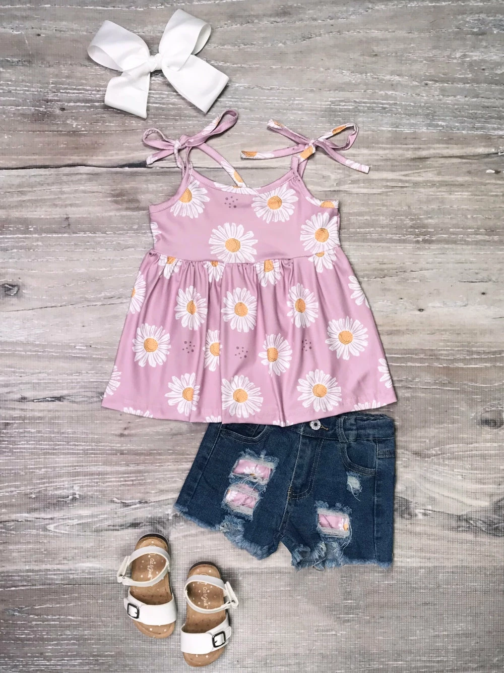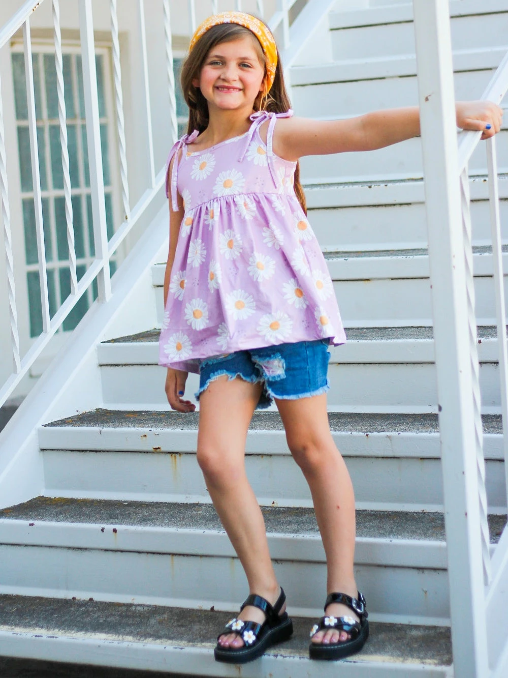 Pick up her new favorite with our enchanting Perfectly Picked Daisy Purple Denim Patch Girls Shorts Outfit! The set comes with an adorable purple sleeveless top that features a daisy pattern, tie straps, and ruffled out bottom. The set also comes with a pair of coordinating denim shorts that feature daisy patterned patches, distressed detailing, and an adjustable elastic waist detail. We are loving this outfit with some sneakers or sandals and a coordinating purple hair bow. The outfit is perfect for vacations, picking flowers, photoshoots, and so much more! Pick up this enchanting favorite and be sure to checkout our other adorable denim outfits.Â