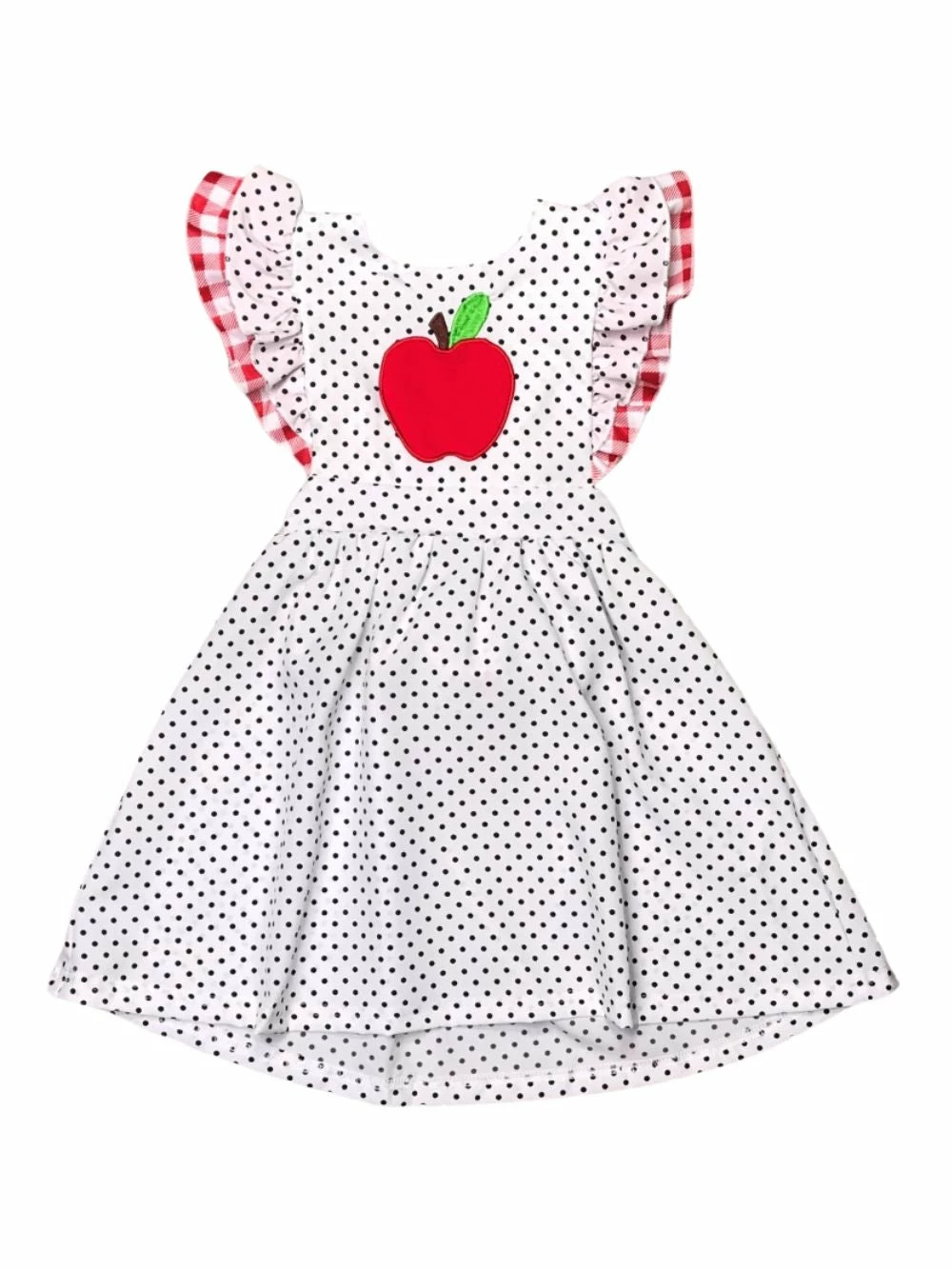 Dress to impress at this year’s fun fall festivities in our Red Apple Polka Dot Gingham Flutter Sleeve Girls Dress! This darling dress features a black and white polka dot and gingham design, a large red apple, and ruffle sleeves that include their own red polka dot detailing. We are absolutely loving this cutesy little dress for apple picking, a day at school, or a family dinner. This dress would be stunning with some red sneakers and a matching hair bow. Pick up this must have dress and be sure to shop our other back to school dresses!Â