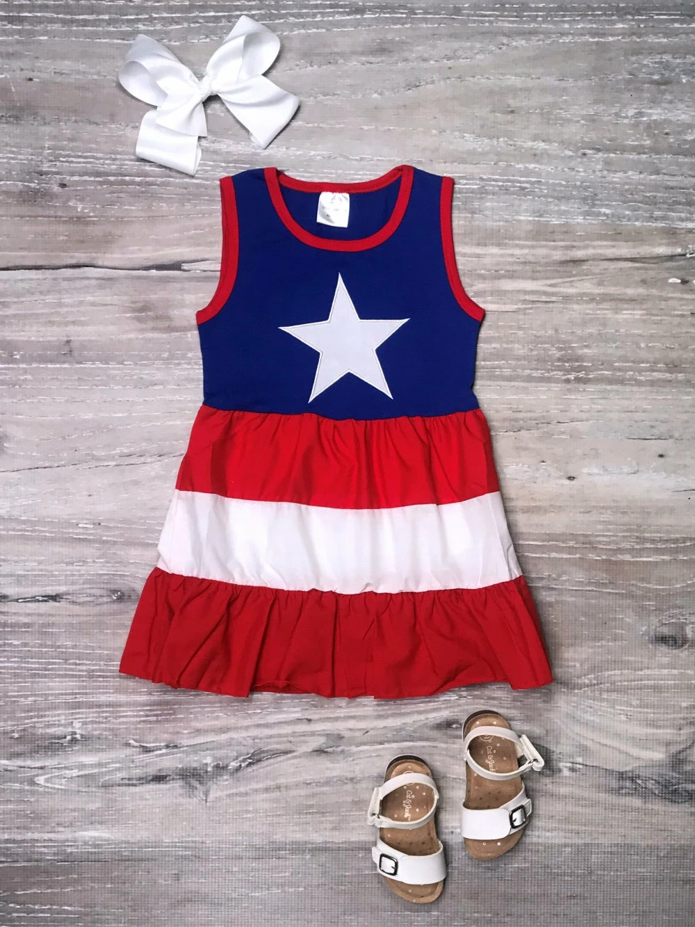 Make your cutie the star of the show this summer in our Star Of The Show Striped Red White, & Blue Tiered Girls 4th Of July Dress! This sleeveless tank dress features a blue top with red trim, a red and white tiered ruffle bottom, and a large white star detail on the front. We are loving this fun little dress with a pair of classic white sandals and some cute sunnies. The dress is perfect for the night of the 4th, parties, beach days, and so much more. Be sure to pick up this must have dress and shop our other patriotic outfits.Â