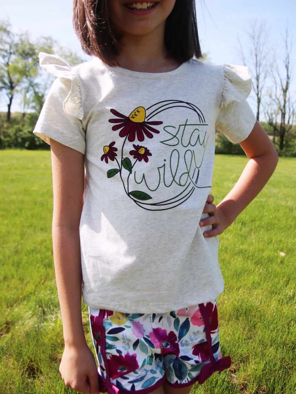 Be wild and wonderful with our darling Stay Wild Wildflower Plum Floral Ruffle Girls Shorts Outfit! The staple set comes with a short sleeve top that features the phrase “Stay Wild,” a flower detail, and ruffle trim. The set also comes with a pair of coordinating shorts that feature a wildflower floral pattern, plum trim, an elastic waistband, and bow details. We are loving this trend setting outfit with some sneakers and a matching plum hair bow. The outfit is perfect for running errands, vacations, picnics, playdates, and so much more. Pick up this must have outfit and be sure to checkout our other fashionable sets.