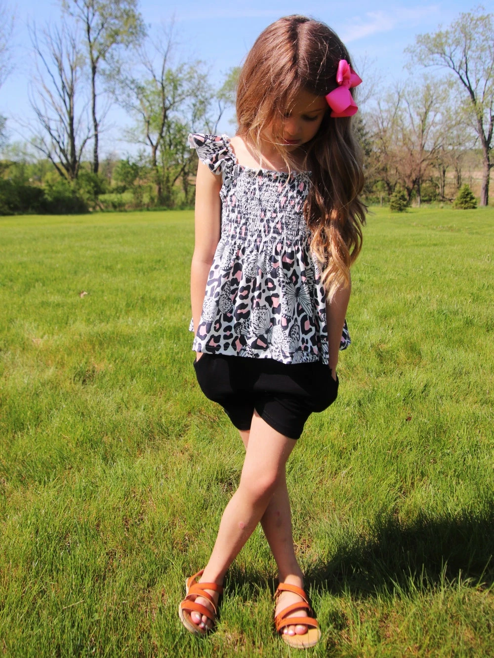 Get that effortless look with our Tropical Butterfly Pink Leopard Ruffle Girls Shorts Outfit! The stylish set comes with a sleeveless top that features a leopard butterfly pattern, flutter sleeves, and ruffle detailing. The set also comes with a pair of coordinating black shorts that feature an elastic waistband. We are loving this outfit with some simple white sneakers or sandals and a matching pink hair bow. The trend outfit is perfect for vacations, playdates, running errands, and so much more. Pick up this outfit and be sure to checkout our other fashionable favorites.