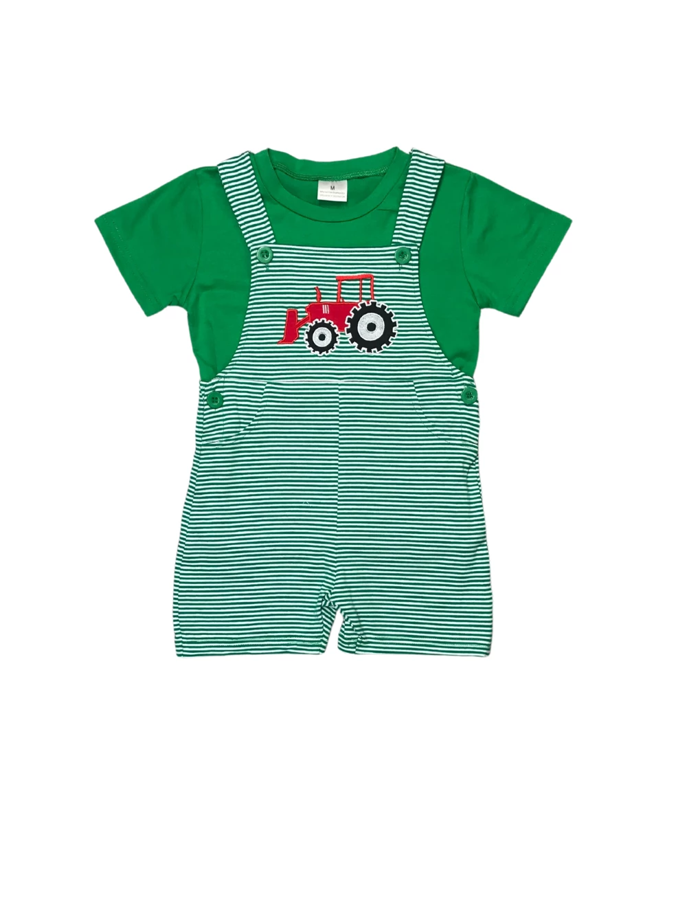 Let your little man look extra stylish in our Vintage Red Tractor Green Stripe Boys Overalls Outfit! The adorable overall set comes with a green short sleeve top. Also included is a matching short overalls that feature pockets, stripes, and a red tractor detail. We love how your little man can mix and match both pieces with items that he already has in his wardrobe. The set is perfect for playdates, parties, running errands, lazy days at home, and so much more. Just pair the outfit with some sneakers and he’ll be ready to go! Pick up this outfit and be sure to checkout our other boys boutique outfits.