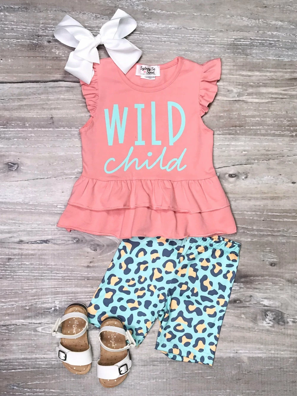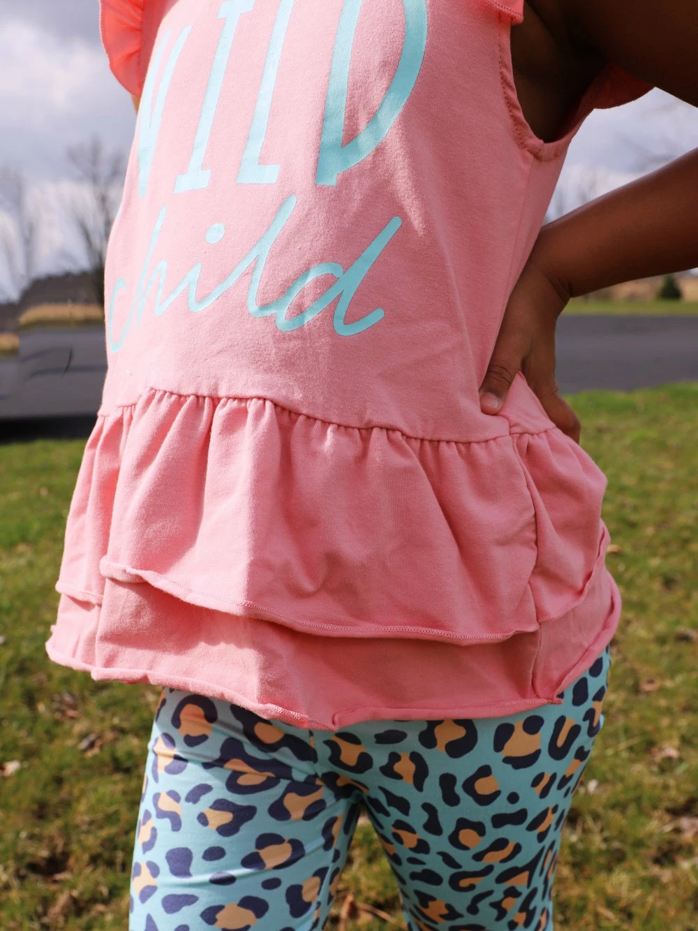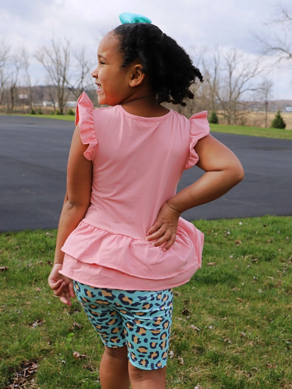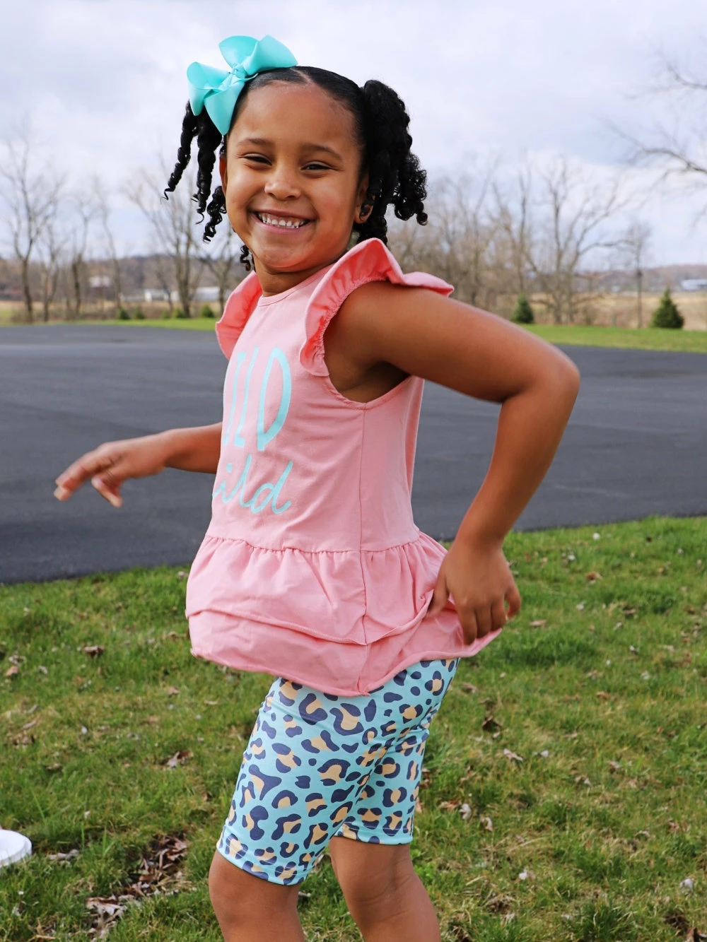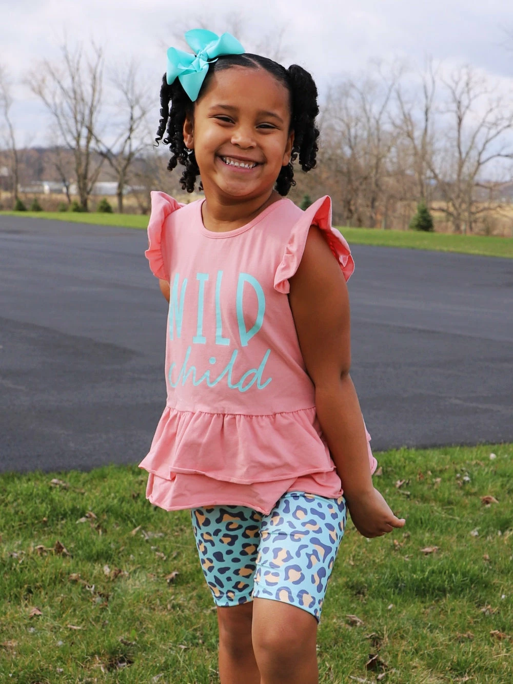 Be wild and free in our fashionable Wild Child Pink & Blue Cheetah Flutter Girls Biker Shorts Outfit! The stylish set comes with a pink short sleeve top that features the phrase “Wild Child,” flutter sleeves, and tiered ruffle trim. The set also comes with a pair of coordinating blue biker shorts that feature a cheetah pattern and an elastic waistband. Don’t you just love how you can mix and match both pieces with items that she already has in her closet?! We are loving this outfit for playdates, vacations, shopping trips, and so much more! Just pair this outfit with some sneakers or sandals and she’ll be ready to take on the day. Don’t forget to checkout our other must have outfits.