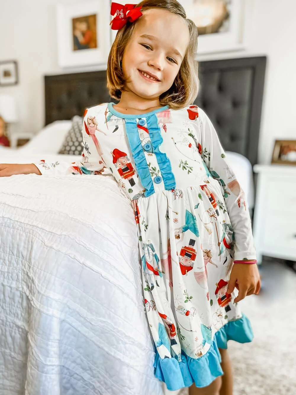 Make her holiday wishes come true with our Nutcracker Dreams Blue Ruffle Girls Christmas Dress! The long sleeve dress features an enchanting nutcracker pattern, light blue trim, ruffle detailing, and buttons. Isn’t the nutcracker pattern just so adorable and perfect for the holiday season?! We are loving this classic dress with a pair of ballet flats and a coordinating light blue hair bow. The dress is perfect for holiday parties, playdates, running errands, school, and so much more! Pick up this dress for your little diva and be sure to checkout our other holiday best sellers!