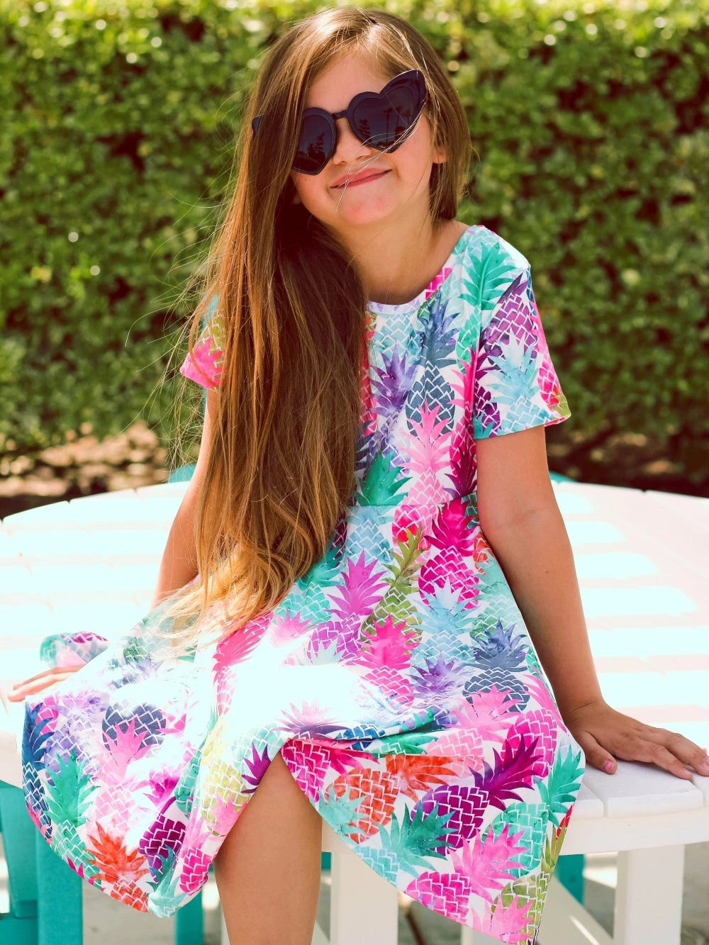 Make it rain pineapples with our fashionable Pineapple Of My Eye Rainbow Short Sleeve Girls Skater Dress! The vibrant short sleeve skater dress features a rainbow pineapple pattern, scoop neckline, and cinched waist. We are loving this dress paired with some sandals and a hair bow for a dressier look or with some sneakers and a jacket for a more laid back look. The dress is perfect for vacations, school, picnics, playdates, running errands, and so much more. Pick up this best selling dress for your little one and be sure to checkout our other best selling dresses and outfits.