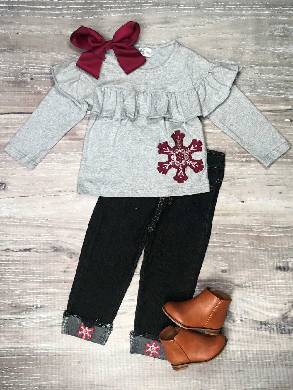 Let the snow into her heart with our One Of A Kind Snowflake Burgundy Girls Denim Outfit! The staple set comes with a gray long sleeve top that features a burgundy snowflake detail and ruffle trim. The set also comes with a pair of coordinating denim jeans that feature cuffed bottoms and embroidered snowflakes. We are loving this classic set with some brown booties or sneakers and a coordinating oversized burgundy hair bow. The set is perfect for running errands, shopping trips, parties, playdates, and so much more. Pick up this outfit while her size is still in stock and be sure to checkout our other must have denim sets!