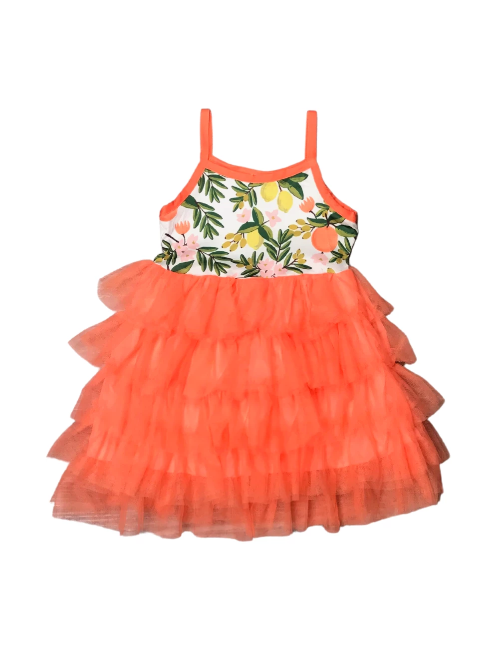 Keep her summer style sweet and simple with our Orange Citrus Floral Tiered Chiffon Tulle Ruffle Girls Dress! The orange sleeveless dress features an orange citrus floral pattern, orange trim, and ruffled chiffon tulle trim. We are loving this fabulous dress with some classic white sandals and a simple white hair bow. The darling dress is perfect for picnics, vacations, shopping trips, playdates, and so much more. Pick up this fashionable dress for your little cutie and be sure to checkout our other trend setting dresses and outfits.