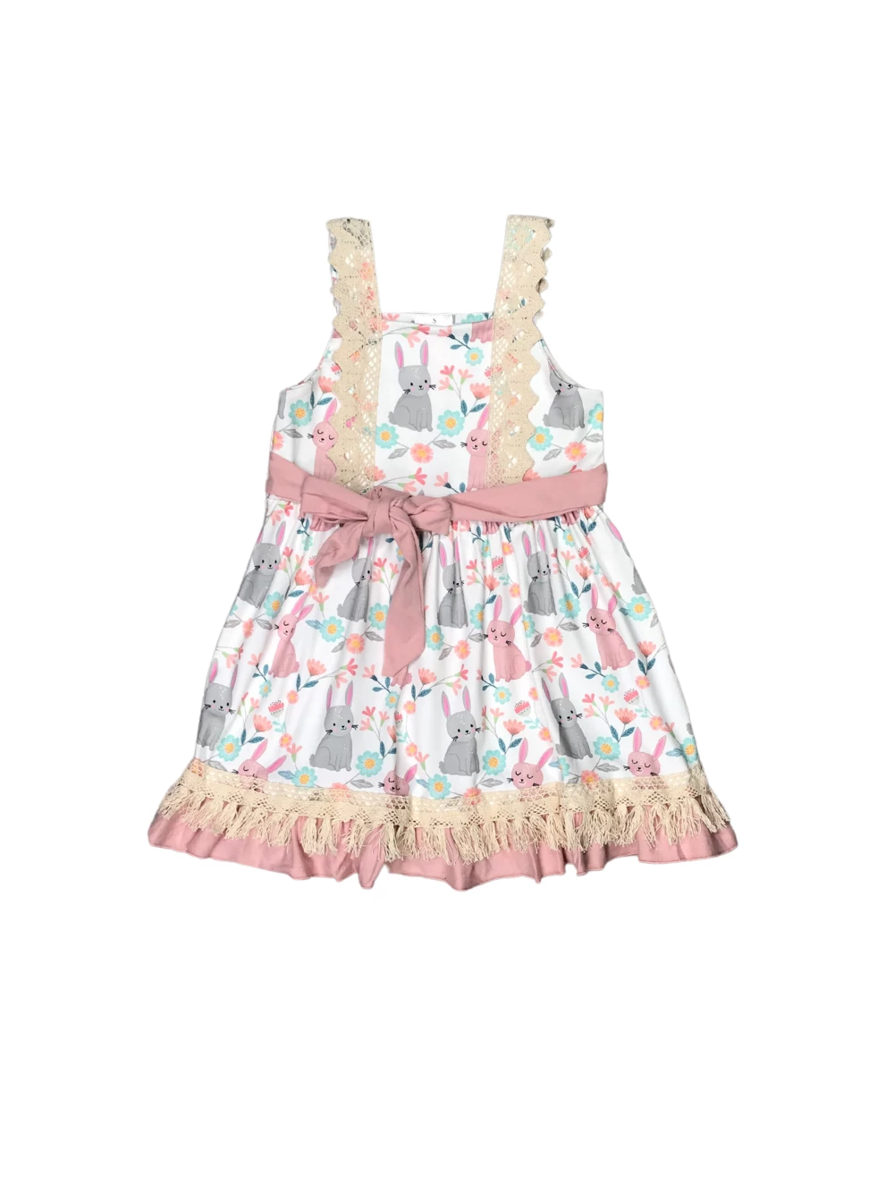 Twirl into the Easter season with our Pastel Pink & Gray Rabbit Ruffle Lace Tank Girls Easter Dress! The super cute tank dress features a pink and gray rabbit pattern, ruffle trim, lace detailing, and a pink tie belt. We are loving this dress with some white sandals and a coordinating pink hair bow. The fashion forward dress is perfect for family photos, Easter brunches, pictures with the Easter bunny, and so much more. Pick up this darling dress for your little bunny and be sure to checkout our best selling Easter themed dresses and outfits.