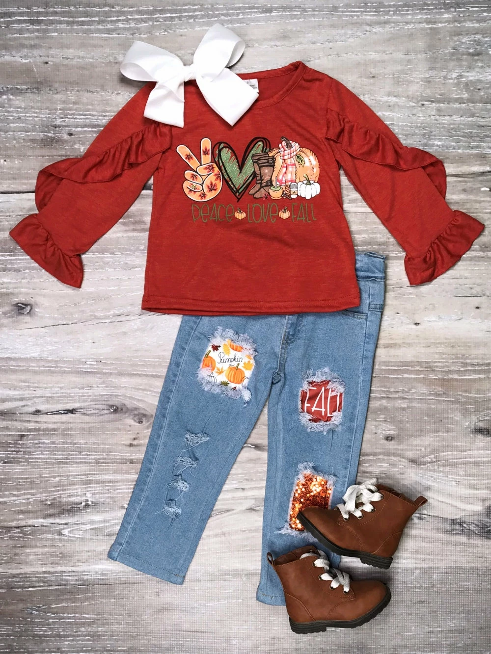 Give us all of the cozy vibes with our best selling Peace, Love, Cozy Fall Pumpkin Denim Girls Fall Outfit! The adorable set comes with a red long sleeve top that features the phrase “Peace Love Fall,” coordinating details, and ruffle detailing. The set also comes with a pair of denim jeans that feature distressed detailing and coordinating patches. We are loving this cozy and stylish outfit with some brown booties and a red hair bow. The outfit is perfect for fall festivities, running errands, school, playdates, and so much more. Pick up this staple outfit and checkout our other fall best sellers!