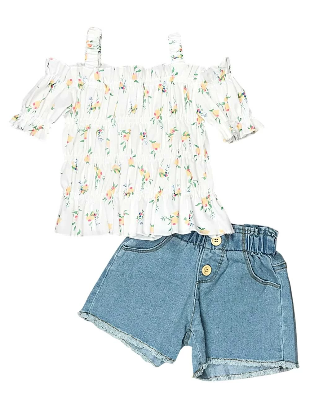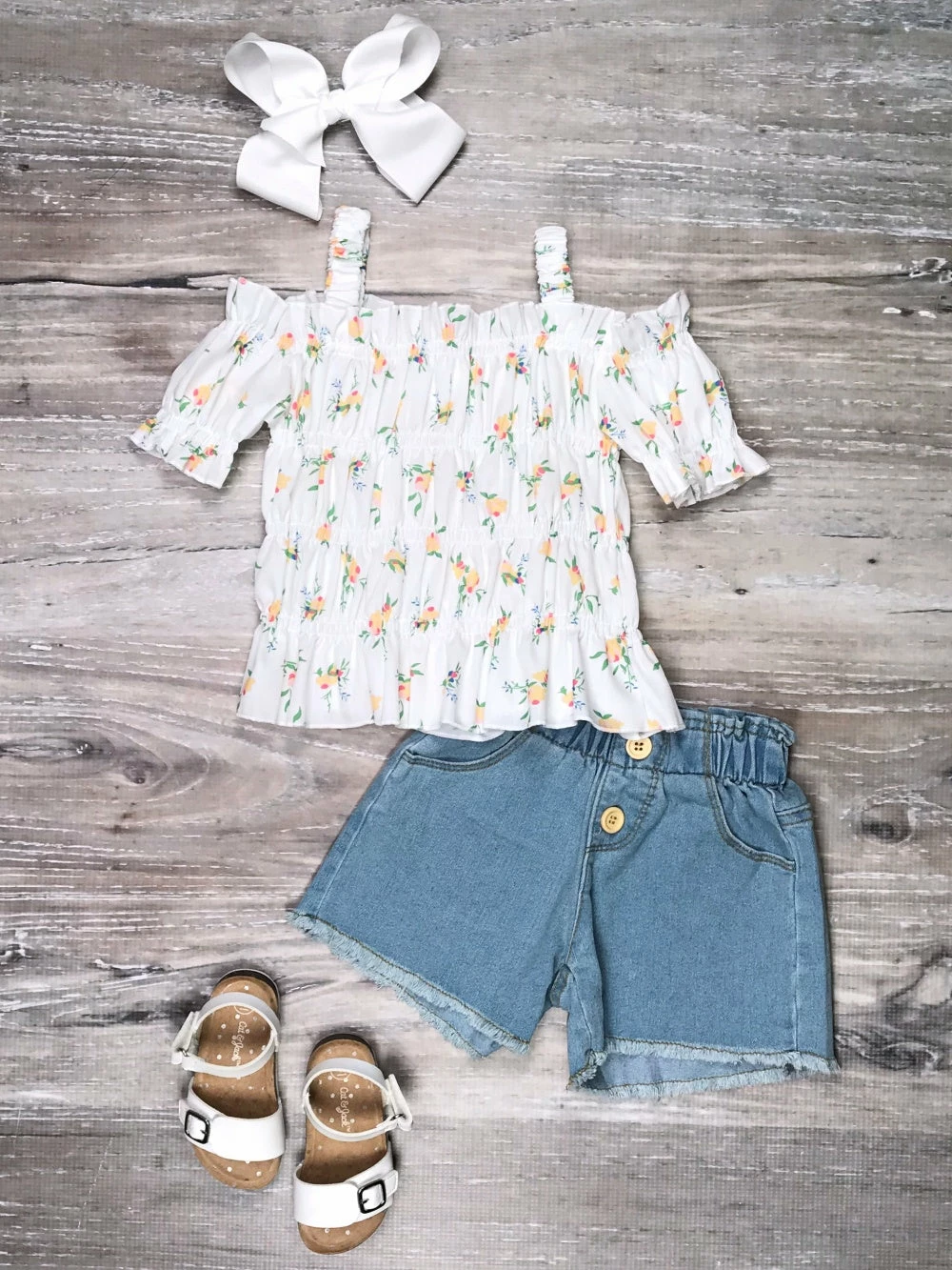 Peaches, peaches, and more peaches! Our Peach Rose Floral Smocked Ruffle Girls Shorts Outfit is the overload of peaches that you’ve been waiting for. The darling set comes with a peach and rose patterned top that includes a smocked cut. The set also comes with a coordinating pair of denim like shorts. The set is perfect for running errands, vacations, picnics, trips to the flea market, and so much more! Pair this set with some trendy sandals and a sassy hair bow and your little peach will be ready to take on the day!