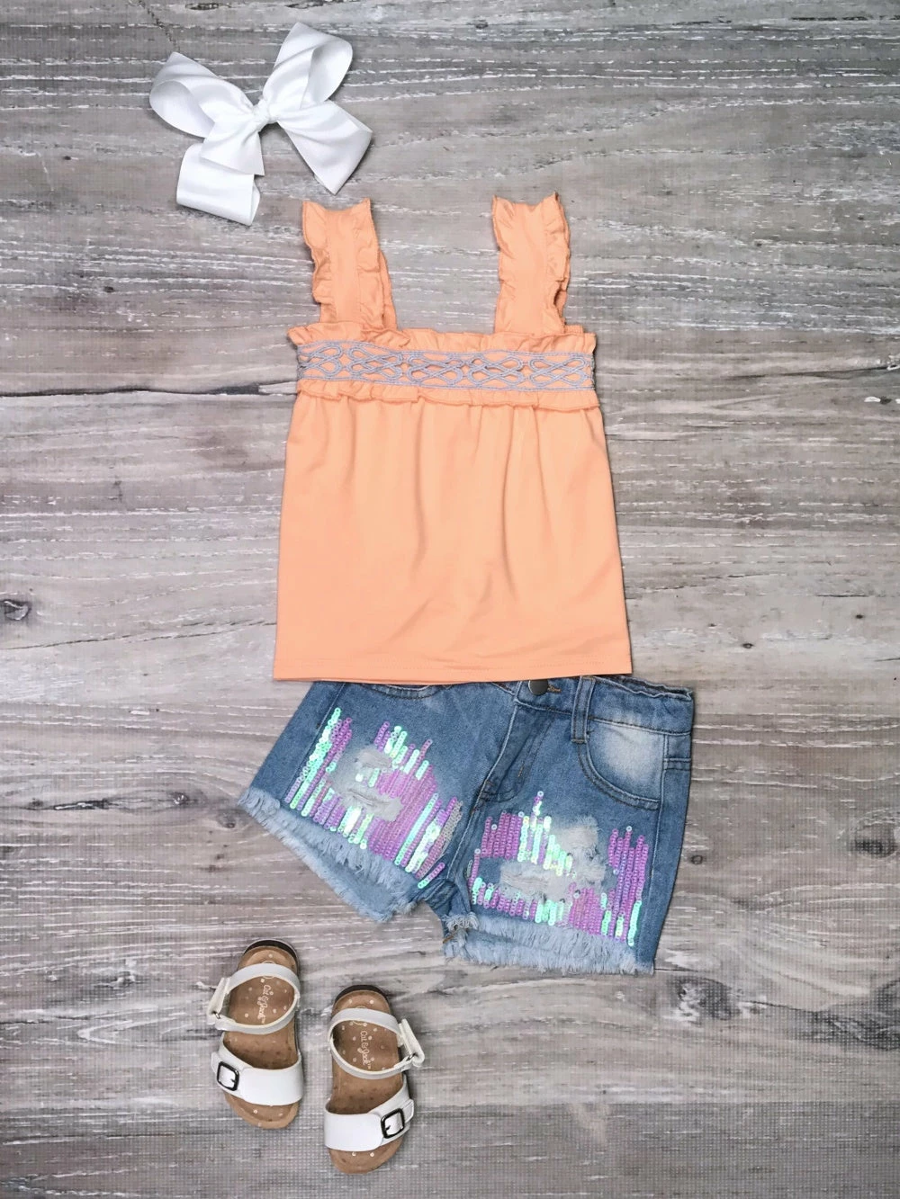 Look and feel just peachy in our Peachy Orange Smocked Sequin Denim Girls Shorts Outfit! This darling set comes with a peach colored smocked tank top that features ruffle detailing on the sleeves and blue knit design across the front. The set also comes with a pair of coordinating denim shorts that feature distressed and sequin detailing as well as an elastic adjustable waistband. We are loving this adorable outfit with some sandals and a matching blue hair bow. This set is perfect for playdates, running errands, vacation, and so much more. Pick up this set and be sure to checkout our other denim outfits.
