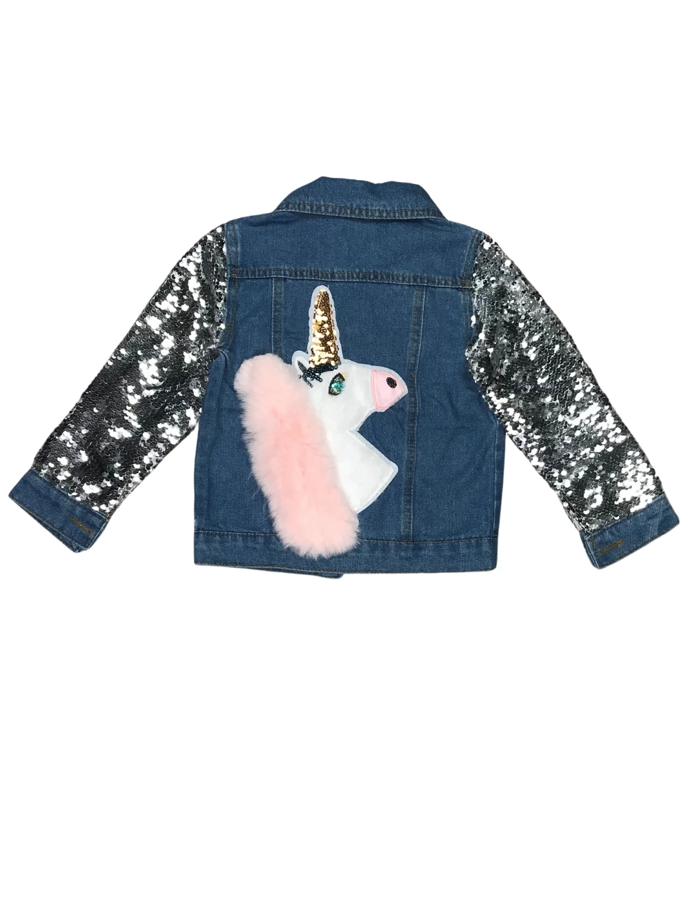 We always talk about pairing outfits with a denim jacket…now you can (with a twist) with our Pink Fuzzy Unicorn Sequin Girls Denim Jean Jacket! The trendy and unique denim jacket features silver flip sequins along the sleeves, an embroidered unicorn detail that features a fuzzy detail that can be removed, and buttons along the front. We are just loving this super fun jacket to add some style and glitz to any boring outfit. The jacket is perfect for school, parties, playdates, running errands, shopping trips, and so much more! Treat your little cutie and add this jacket to your cart while it’s still available and checkout our other best selling items.