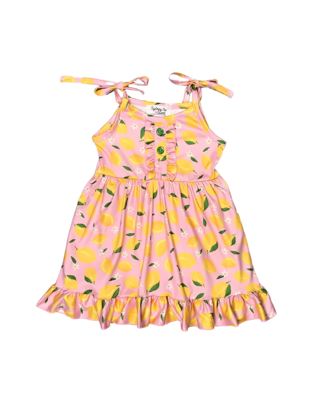 Spoil your main squeeze with our fashionable Pink Lemonade Ruffle Tie Strap Girls Tank Dress! The pink sleeveless dress features an adorable lemon pattern, tie straps, buttons, and ruffle trim. We are loving this best selling dress by itself with some sneakers or dressed up with some sandals and a hair bow. The super sweet dress is perfect for picnics, parties, playdates, vacations, shopping trips, and so much more. Pick up this darling dress for your little sweetie and be sure to checkout our other must have dresses and outfits.