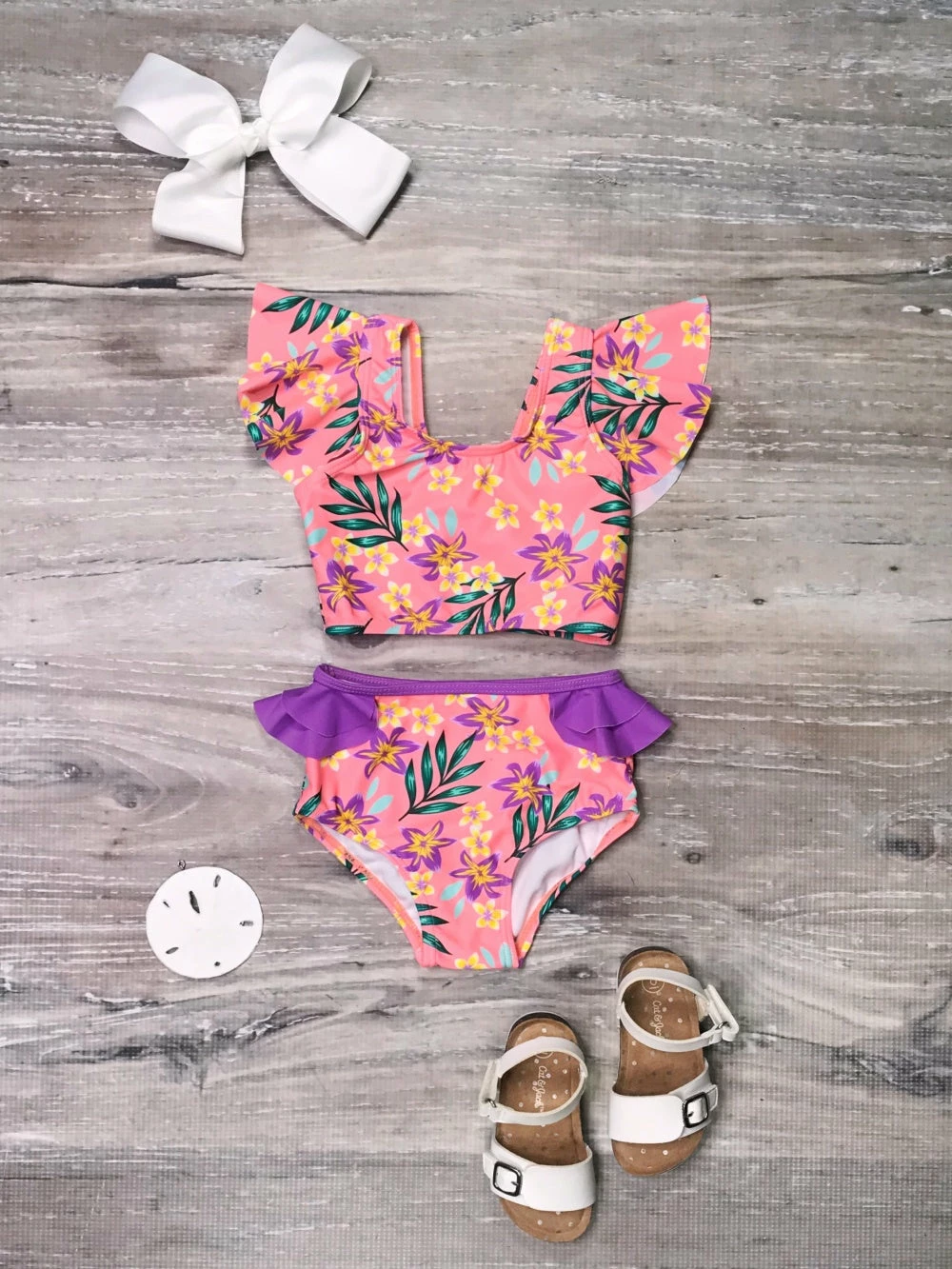 You cannot possibly take on the tropics without our Pink & Purple Tropical Vacation High Waisted Ruffle Girls Swimsuit Bikini! The trendy bikini comes with a pink bikini top that features a tropical floral pattern, short sleeves, and flutter detailing. The set also comes with a pair of coordinating bikini bottoms that feature a tropical floral pattern, purple trim, and ruffle detailing. We are loving this bathing suit with some sandals and vibrant sunnies. The bathing suit is perfect for vacations, pool parties, trips to the waterpark, and so much more. Pick up this fashionable fav while her size is still in stock and be sure to checkout our other best sellers.