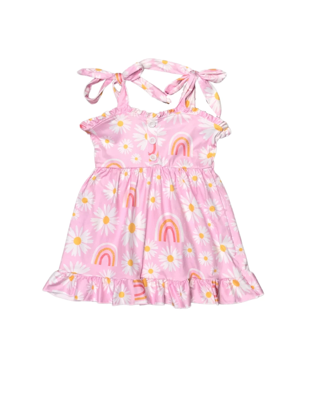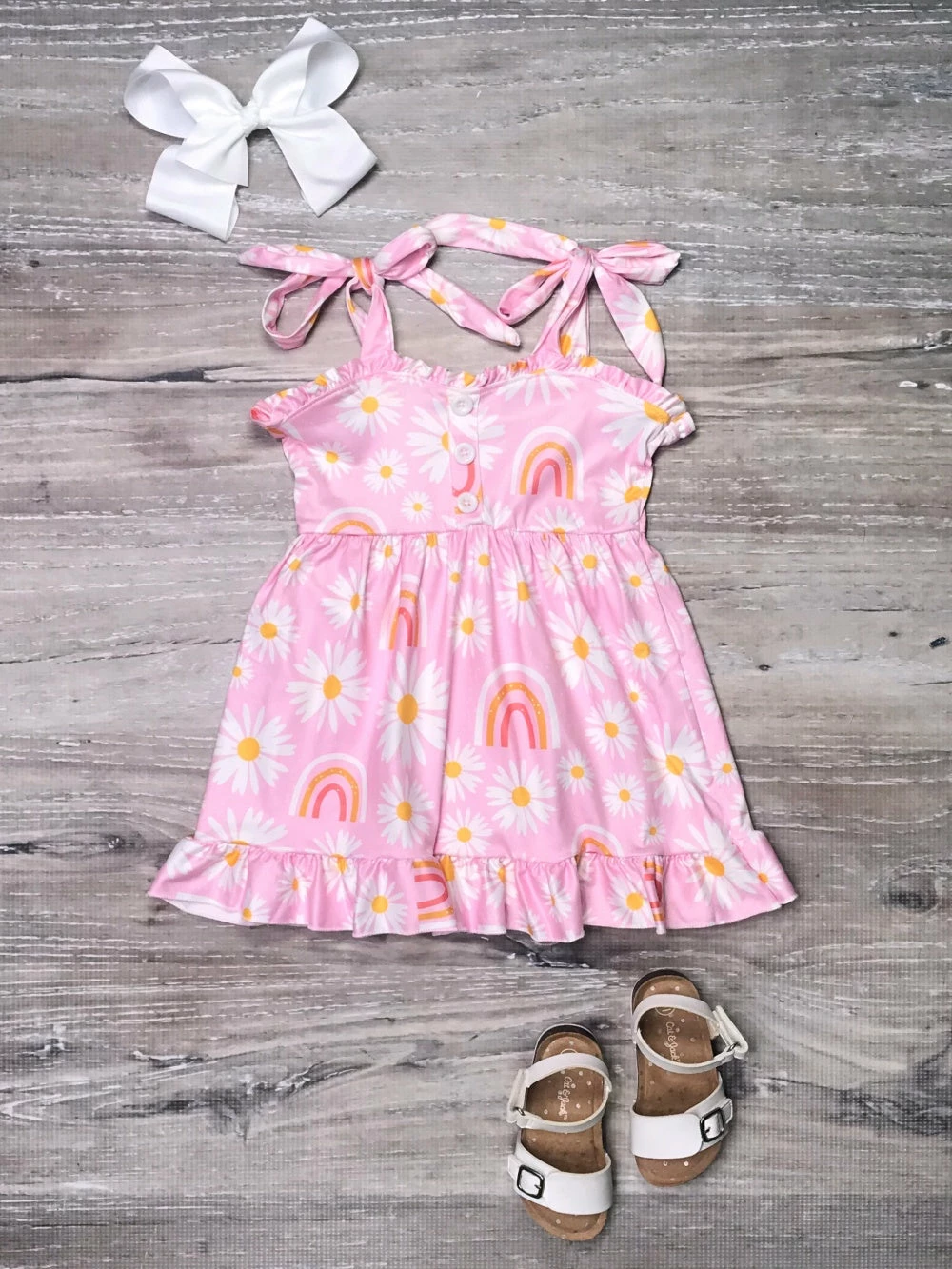 Help her welcome the summer rainbows and daisies in our Pink Rainbows & Daisies Ruffle Cold Shoulder Girls Dress! This pink sleeveless dress features a rainbow and daisy filled pattern, ruffle detailing, tie straps, and adorable little buttons. This theme is perfect for this upcoming season! We are loving this dress for dinner dates, parties, shopping trips, playdates, and so much more. This dress paired with some sandals and a hair bow will have her ready for fun in the sun! Pick up this must-have dress before it’s too late and be sure to check out our other pretty dresses.