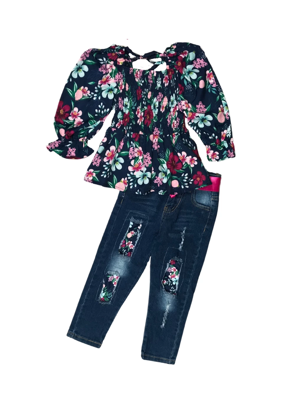 Freshen up her fabulous wardrobe with our Plum Navy Floral Smocked Cinch Top Girls Patch Denim Jeans Outfit! The trendy set comes with a navy long sleeve smocked top that features a plum floral pattern, tie back, and cinched sleeves. The set also comes with a pair of coordinating denim jeans that feature coordinating floral patterned patches and distressed detailing. Also included is a coordinating plum tie belt. We are loving this fashionable outfit with some booties and a coordinating plum hair bow. The set is perfect for school, running errands, and so much more. Pick up this outfit for your little cutie and checkout our other must have denim sets.
