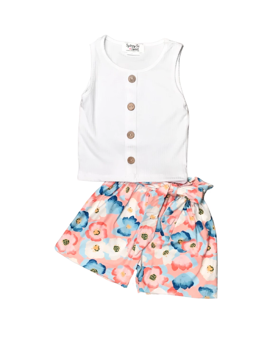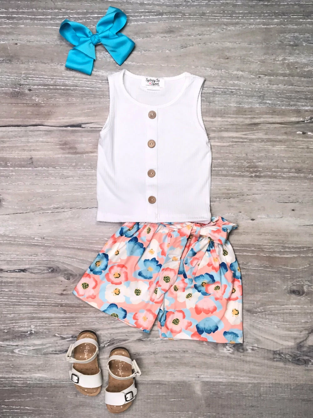 Look like perfection this summer in our Posie Perfection Pink & Blue Floral Girls Shorts Outfit! This adorable set comes with a white ribbed tank top dressed up with buttons. The tank is paired with a bright pair of coral pink shorts that feature blue and white flowers and a cinched ruffled waistline, tied together with a matching tie bow belt. We are obsessed with this shorts outfit styled with a pair of sandals and a coordinating headband. This outfit is perfect for playdates, running errands, shopping trips, and so much more. Pick up this outfit for your little cutie just in time for summer!