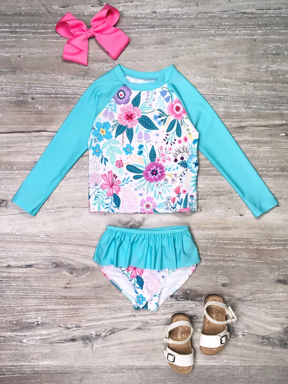 Look pretty and perfect in our fabulous Pretty In Peonies Blue Ruffle Long Sleeve Girls Swimsuit! The stylish set comes with a long sleeve swim top that features a peony floral pattern and blue sleeves. The set also comes with a pair of coordinating bottoms that feature a peony floral pattern and blue ruffle trim. We are loving this swimsuit with some sunnies and sandals. The bathing suit is perfect for vacations, beach days, pool parties, trips to the waterpark, and so much more. Add this must have swimsuit to her collection and be sure to checkout our other swimsuits.
