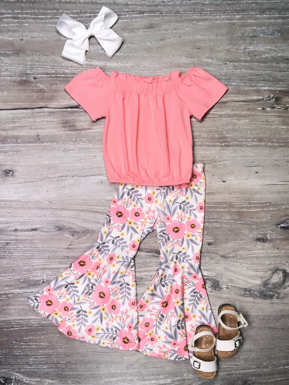 Pose in posies with our must have Purple Pink Posie Floral Bell Bottom Ruffle Girls Boutique Outfit! The stylish set comes with a pink short sleeve top that features scrunched detailing and a cold shoulder cut. The set also comes with a pair of coordinating bell bottoms that feature a floral posies pattern and an elastic waistband. We are loving this outfit for school, vacations, playdates, and so much more. Just pair this outfit with some sandals and a pink hair bow and she’ll be ready to roll. Pick up this must have set and be sure to checkout our other fashionable outfits.