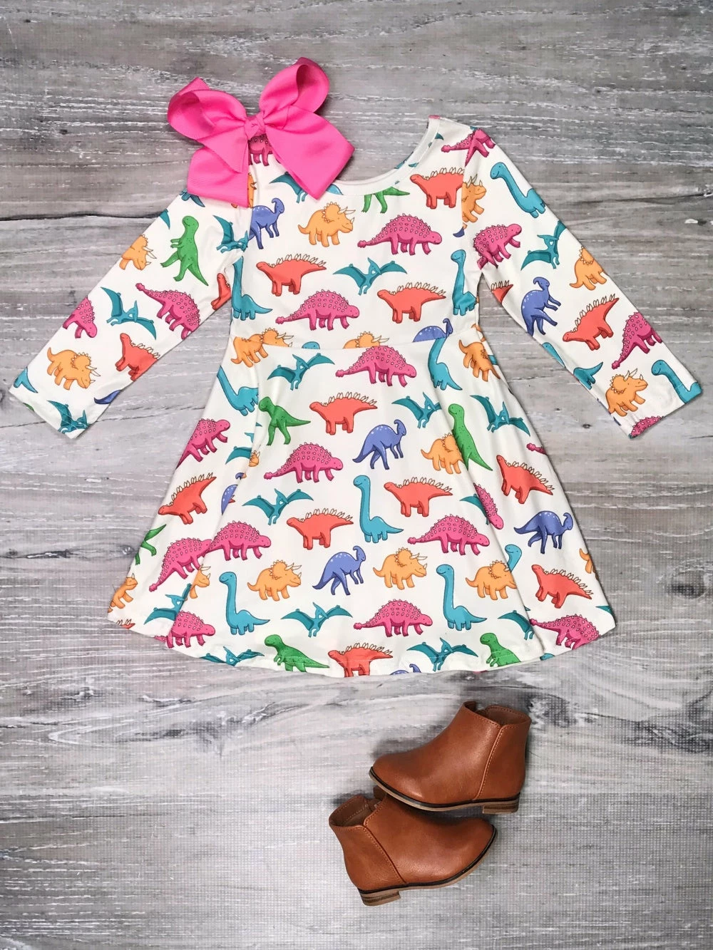 Brighten up her wardrobe with our Rainbow Land Before Time Dinosaur Long Sleeve Girls Skater Dress! The fashionable long sleeve skater dress features a rainbow dinosaur pattern, a scoop neckline, and cinched waistline. We are loving his dress with some knee high socks, booties or sneakers, and a coordinating hair bow. The dress is perfect for parties, school, playdates, running errands, trips to the museum, and so much more! Pick up this best selling dress while her size is still in stock and be sure to checkout our other must have dresses or outfits.