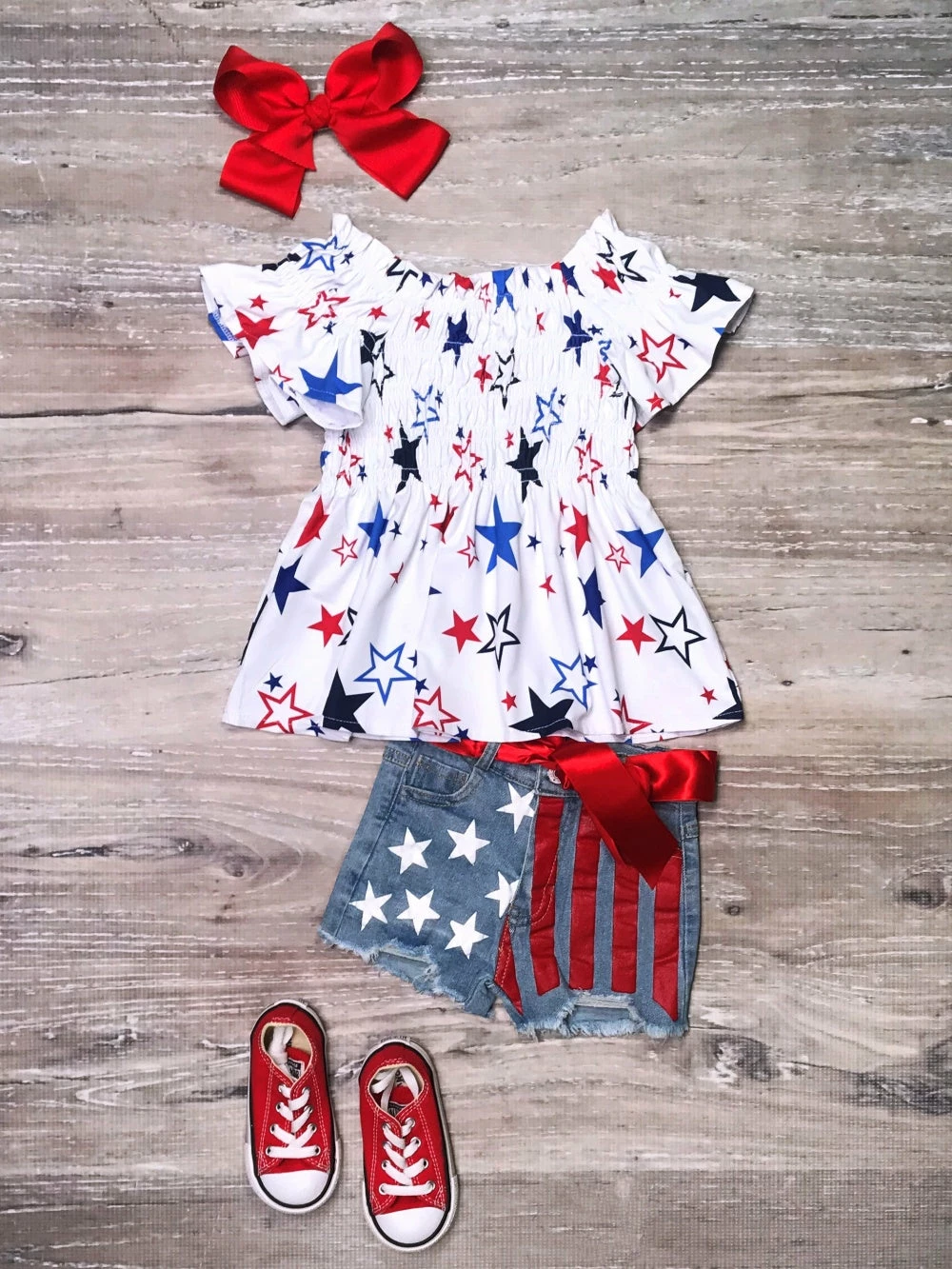 Show up to the 4th of July festivities in style this year in our Red, White, & Blue Patriotic Stars Flag Denim Girls 4th Of July Shorts Outfit! This patriotic set comes with a white top featuring a red and blue star pattern, flutter sleeves, and a cinched waist detail. This set also comes with a pair of unique denim shorts that feature white stars on one side and red stripes on the other, a red tie bow belt, and an elastic waistband. We are loving this outfit with a pair of white sandals and a matching red hair bow. This set is perfect for cookouts, parties, playdates, and so much more. Pick up this fun and funky set and check out more of our patriotic outfits now!Â