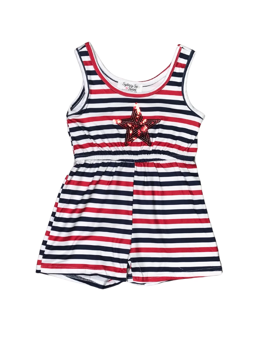 Pop off like a firework in our fabulous Red, White, & Blue Stripe Sequin Star Girls Patriotic Romper! The sleeveless romper features a red, white, and blue striped pattern, a sequined star detail, and a cinched waist. We are loving this super fun romper with a pair of classic white sneakers or sandals and a coordinating patriotic colored hair bow. The romper is perfect for cookouts, pool parties, watching fireworks, playdates, and so much more. Pick up this romper for your patriotic little one and be sure to checkout our other best selling patriotic pieces.