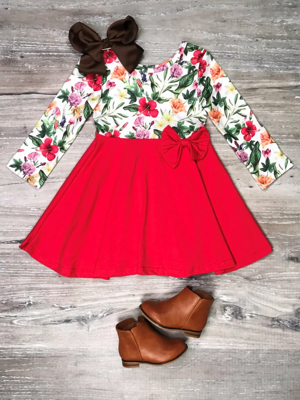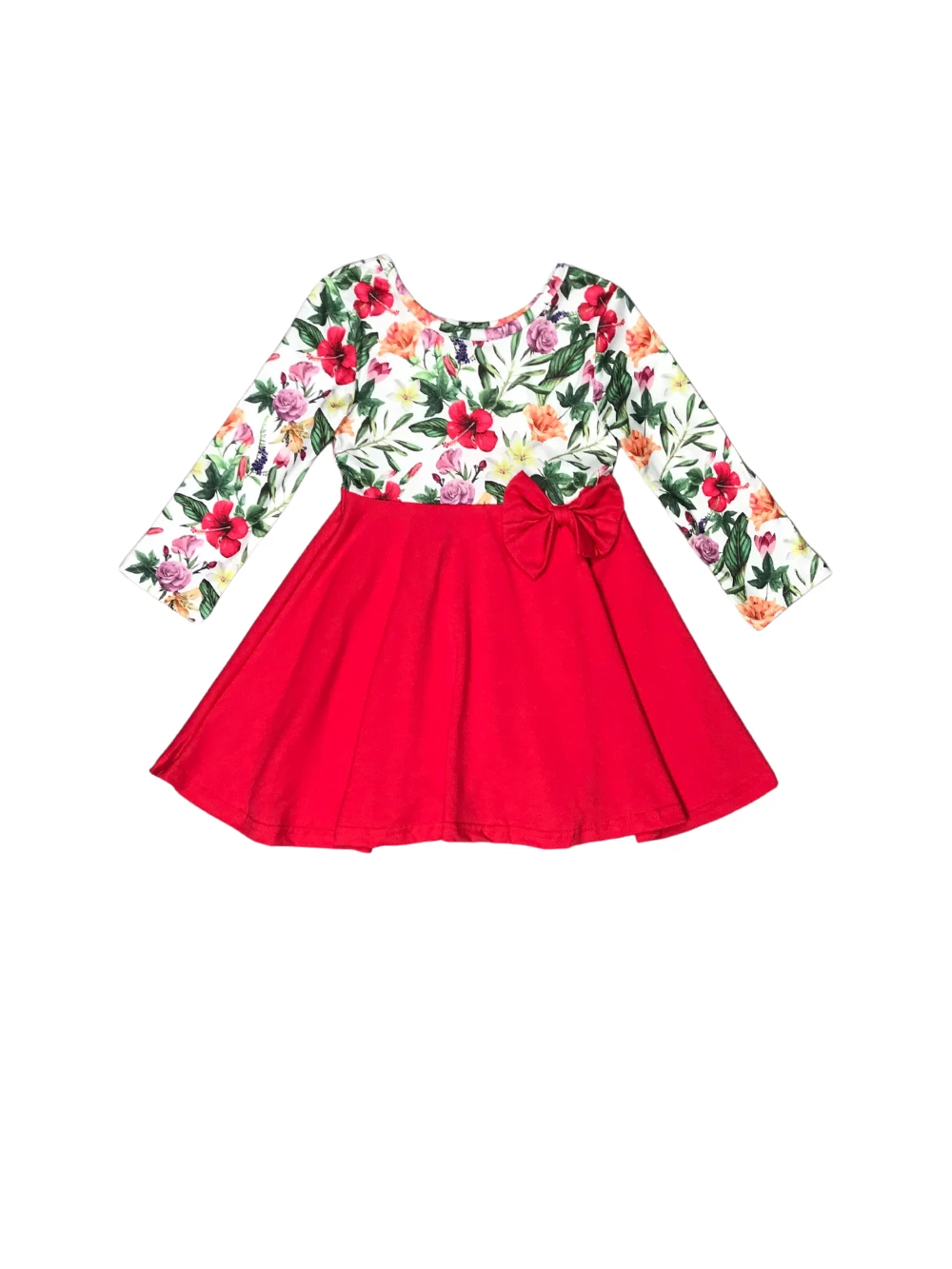 Bring the florals into the colder weather with our fabulous Red Winter Floral Long Sleeve Girls Skater Dress! The long sleeve skater dress features a floral pattern along the top, a vibrant shade of red along the bottom, a scoop neckline, and a bow detail. We are loving this dress with some brown booties and a stylish hair accessory. The dress is perfect for holiday parties, photoshoots, school, running errands, and so much more! Pick up this dress for her winter wardrobe and checkout our entire best selling dress collection!