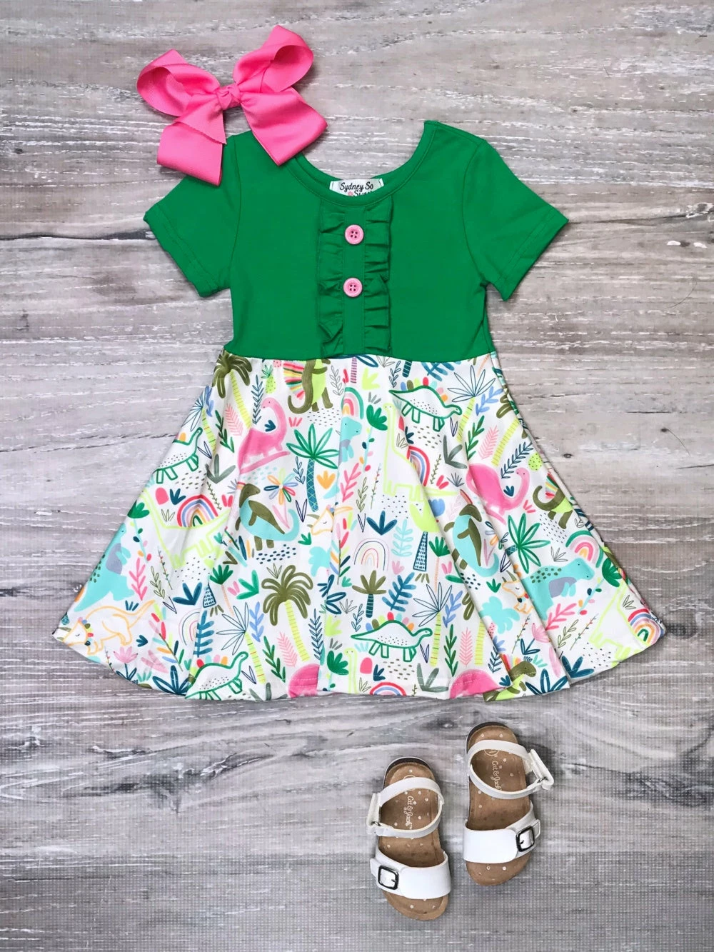 Roar your way into summer with our dino-mite Rockin’ & Roarin’ Green & Pink Dinosaur Ruffle Girls Dress! The green short sleeve dress features a colorful dinosaur pattern, , teal trim, green ruffle detailing, and buttons. We are loving this dress with some sneakers or sandals and a coordinating teal hair bow. The trend setting dress is perfect for picnics, school, parties, playdates, shopping trips, and so much more! Pick up this darling dress while her size is still in stock and be sure to checkout our other fashion forward dresses.