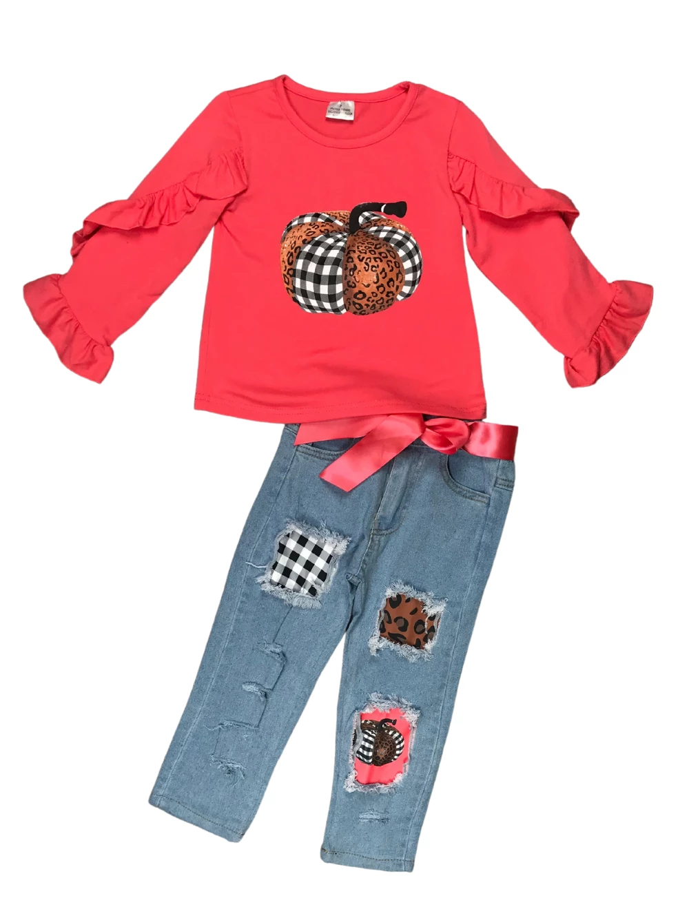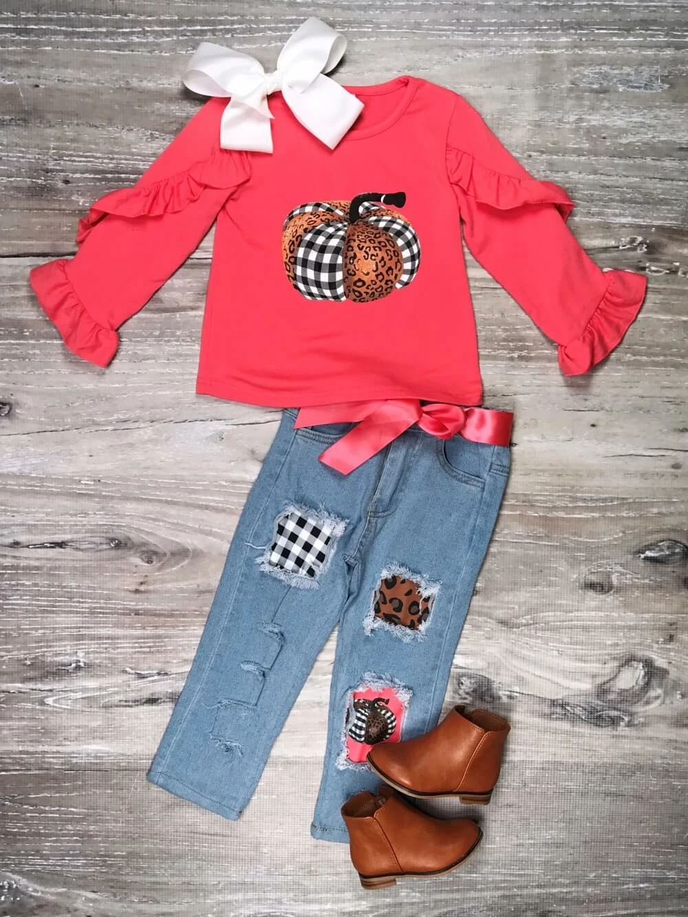 Roses are red, violets are blue, our Rosey Pink Country Ruffle Pumpkin Plaid Girls Denim Outfit was made just for you! The girly set comes with a rose pink colored long sleeve top that features a multi-patterned pumpkin detail and ruffle trim along the sleeves. The set also comes with a pair of light wash denim jeans that feature distressed detailing and coordinating patches. We are loving this stylish set with some booties or sneakers and a girly hair bow. The set is perfect for school, trips to the pumpkin patch, running errands, family parties, and so much more. Pick up this stylish set and checkout our other fashionable fall sets.