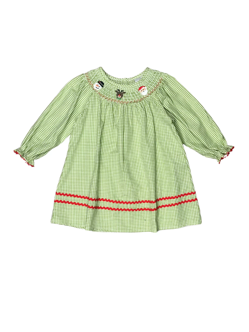Mix up her holiday style with our fashion forward Santa Friends Green Gingham Smocked Collar Girls Dress! The dress features a green gingham pattern, holiday character details along the collar, smocked detailing, and red trim. We are loving this dress with some brown booties and a large red hair bow. The dress is perfect for running errands, holiday parties, playdates, shopping trips, and so much more! Pick up this must have dress while her size is still in stock and be sure to checkout our other must have holiday pieces.