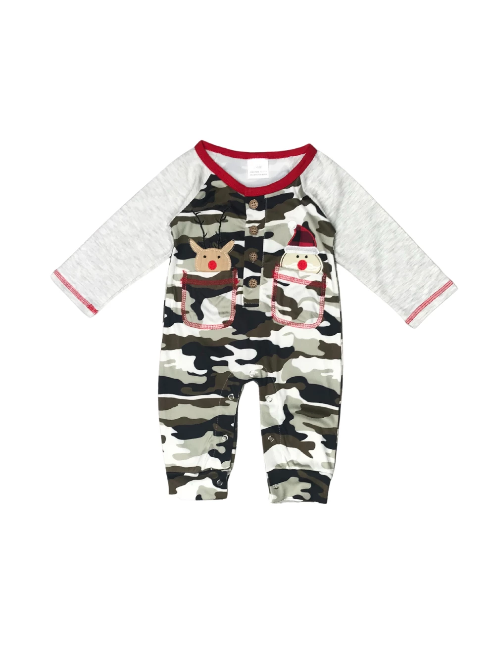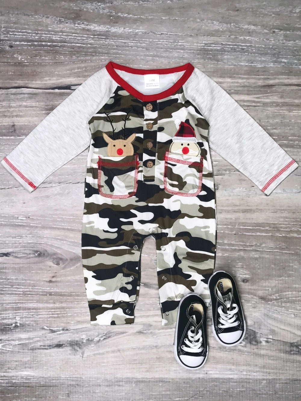 Have his holiday wardrobe ready to go with our Santa’s Reindeer Camo Raglan Boys Christmas Baby Romper! The long sleeve romper features a camouflage pattern, a Santa and reindeer detail, buttons, red trim, and snaps along the bottom. We love how convenient the snaps are for quick and easy diaper changes. The romper is perfect for running errands, lazy days at home, movie nights, holiday parties, and so much more! Just pair the romper with some booties or sneakers and your little guy will be ready to go. Make sure that you also checkout our other best selling holiday pieces for your littlest one!
