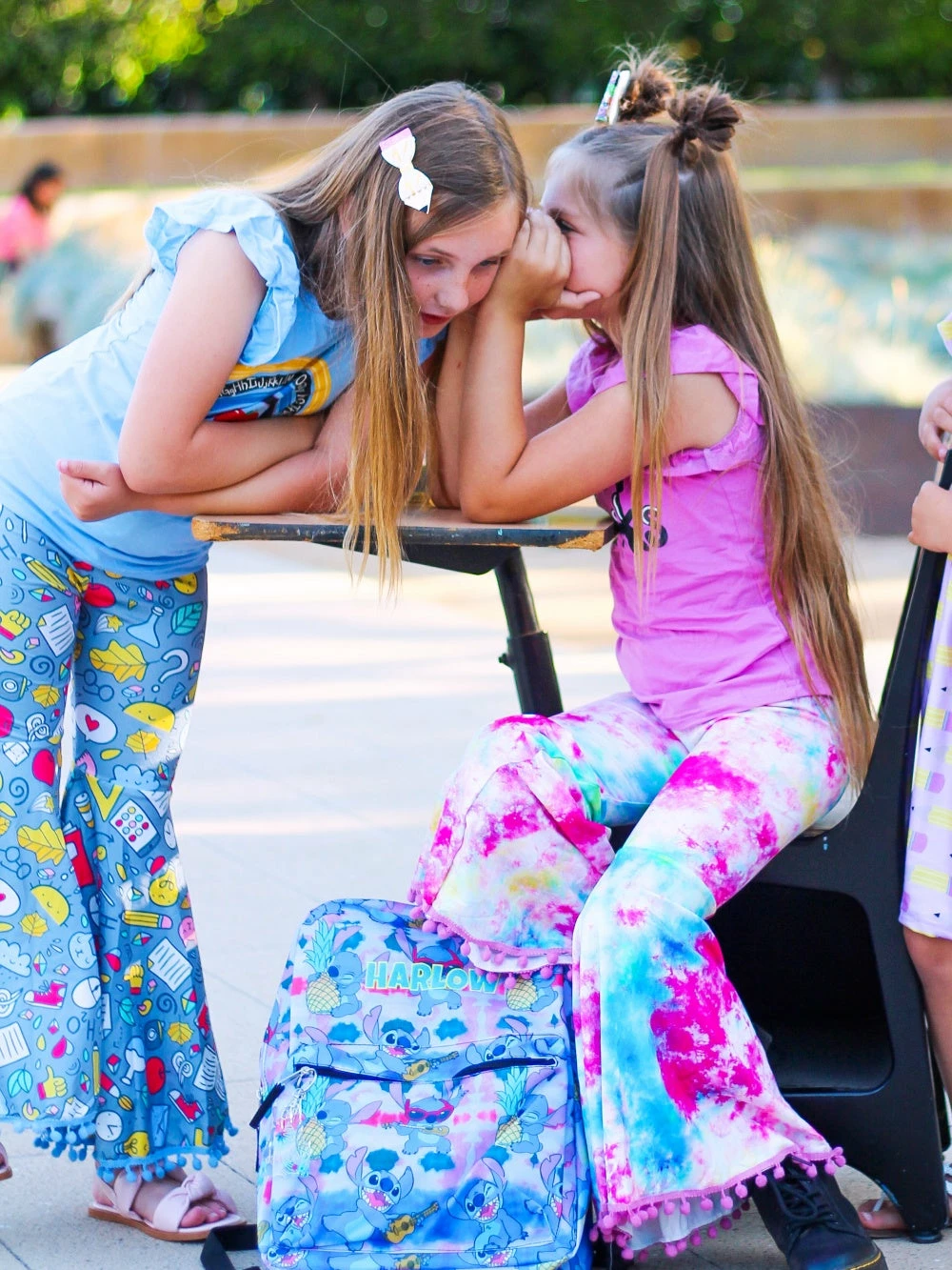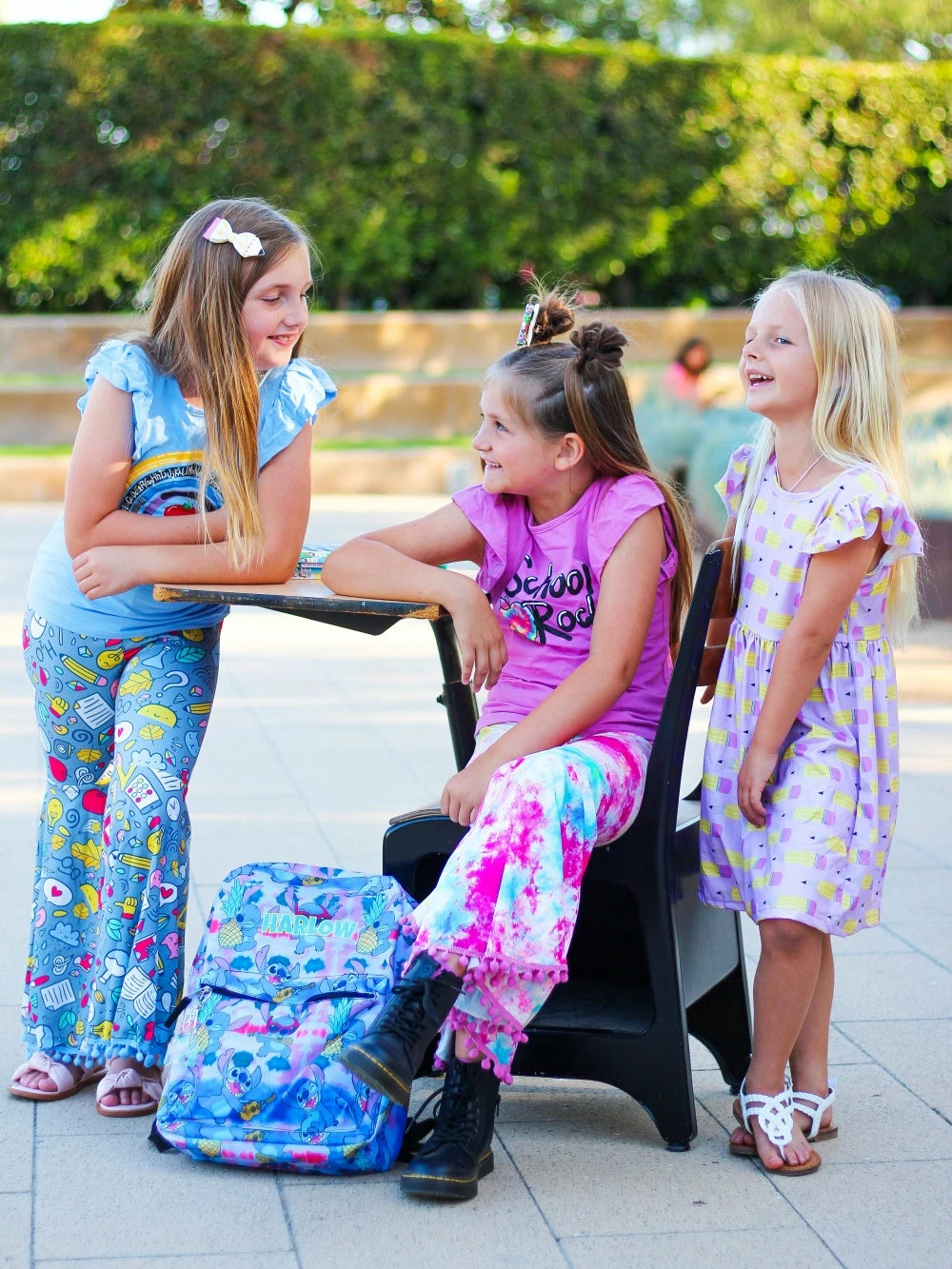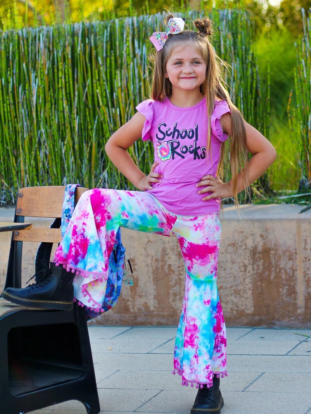 Help your little rock the school this year in our School Rocks Rainbow Tie Dye Bell Bottom Girls Back To School Outfit! This stylish set comes with a pink short sleeve top that features the phrase “School Rocks”, a unique tie dye design, and flutter sleeves. This set also comes with a pair of coordinating rainbow tie dye bell bottoms with pom pom details on the bottoms and an elastic waistband. We are loving this outfit with some colorful sneakers and a coordinating tie dye hair bow. The outfit is perfect for making a fashion statement at school in the best way. Pick up this sassy set and be sure to checkout our back to school outfits.