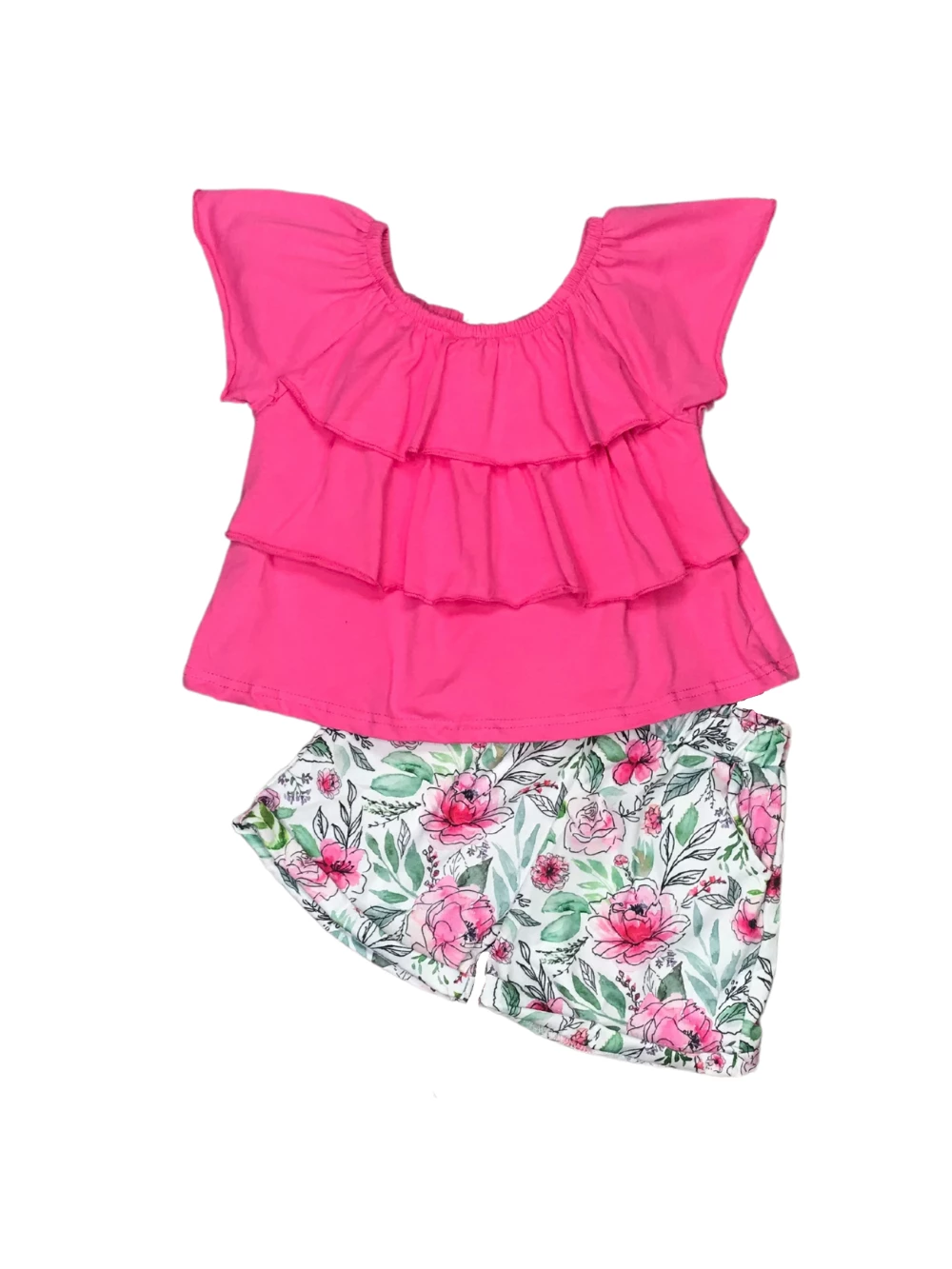 Freshen up her collection with our Hosta La Vista Baby Watercolor Floral Pink Ruffle Girls Shorts Outfit! The set comes with a pink short sleeve top that features a cold shoulder cut and tiered ruffle detailing. The set also comes with a pair of coordinating shorts that feature a watercolor floral pattern and elastic waistband. We are loving this set with some sneakers or sandals and a coordinating pink hair bow. The shorts set is perfect for playdates, parties, running errands, shopping trips, and so much more. Pick up this staple set while it’s still in stock and be sure to checkout our other best selling summer sets.