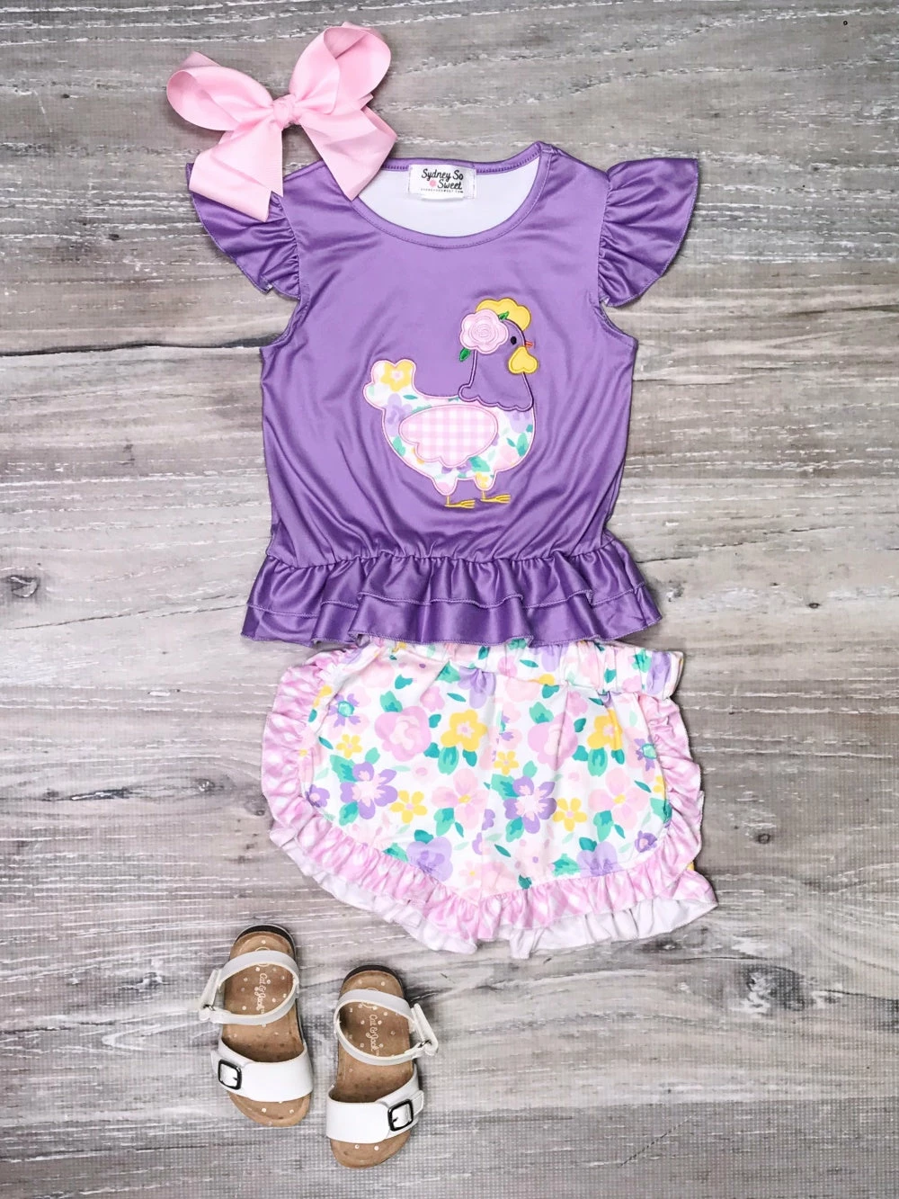 Ruffle her feathers and treat her to our Rooster Ruffles Purple & Yellow Floral Girls Shorts Outfit! The darling set comes with a purple short sleeve top that features a floral patterned rooster detail, flutter sleeves, and ruffle trim. The set also comes with a pair of coordinating shorts that feature a purple and yellow floral pattern, ruffle trim, and an elastic waistband. We are loving this cutesy outfit with some classic white sneakers or sandals and a coordinating hair bow. The outfit is perfect for vacations, picnics, trips to the petting zoo, and so much more. Pick up this darling favorite and be sure to take a look at our other must have sets.
