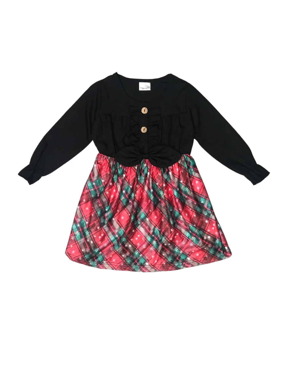 Get ready for the arrival of snow with our Snowflake Buffalo Plaid Black Button Ruffle Girls Christmas Dress! The enchanting black long sleeve dress features ruffle detailing, buttons, a snowflake buffalo plaid pattern along the bottom, and a bow detail. We are loving this charming dress with some white knee high socks, booties, and a coordinating red or green hair bow. The dress is perfect for holiday parties, family photos, school, playdates, shopping trips, and so much more! Pick up this dress while her size is still available and be sure to checkout our other must have holiday and winter dresses!