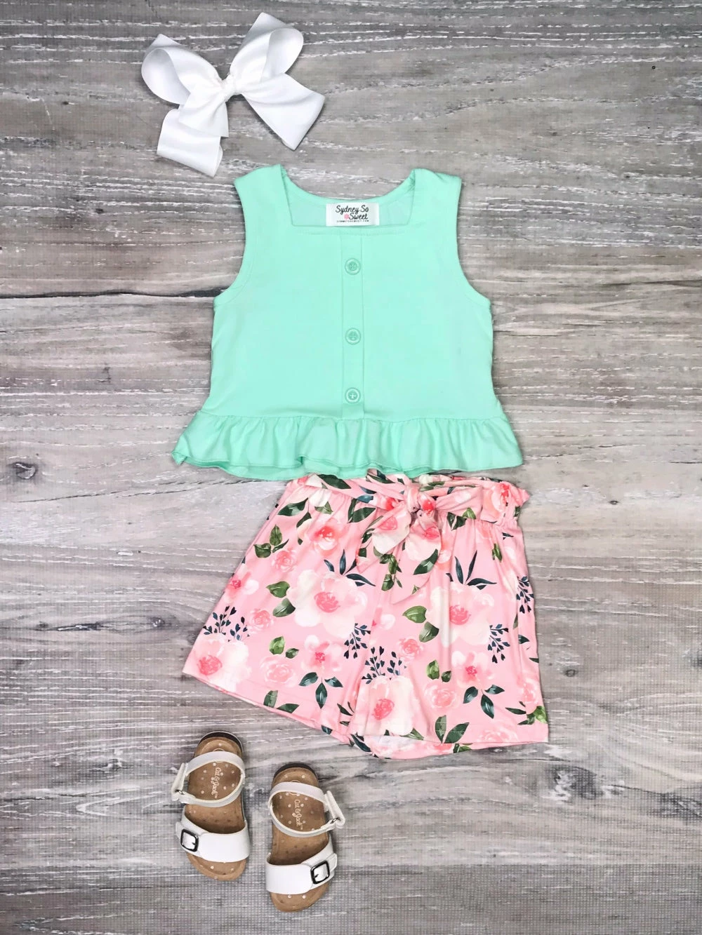 Look sassy in sage in our stylish So Sage Pink Floral Peplum Ruffle Girls Shorts Outfit! The set comes with a sage green sleeveless top that features a peplum style cut, ruffle trim, and buttons. The set also comes with a pair of coordinating pink shorts that feature a floral pattern, tie belt, and an elastic waistband. We are loving this outfit with some sneakers or sandals and a coordinating pink hair bow. The fashionable outfit is perfect for vacations, shopping trips, running errands, and so much more. Pick up this shorts set and be sure to checkout our other must have outfits.