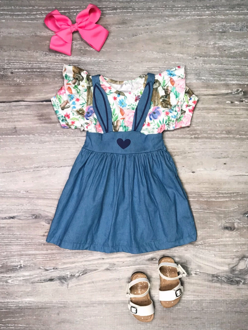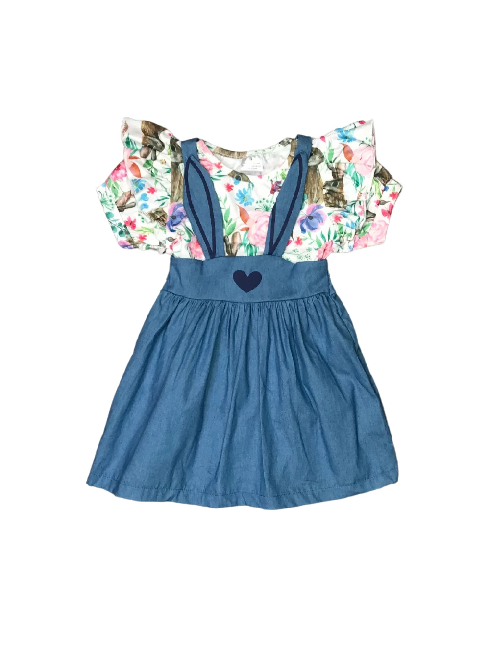 Embrace the love with our Some Bunny To Love Floral Flutter Sleeve Girls Easter Jumper Dress! The set comes with a short sleeve top that features a floral bunny patterned and ruffle detailing. Also included is a coordinating chambray dress that features bunny details. We are loving this outfit with some sneakers or sandals and a coordinating spring colored hair bow. The girly set is perfect for school, running errands, parties, playdates, Easter festivities, and so much more. Spoil your little sweet bunny and pickup this set for those upcoming parties and be sure to checkout our other essential Easter outfits and dresses.