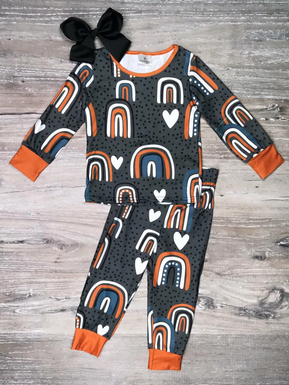 Dream of rainbows and sunshine with our Somewhere Over The Rainbow Polka Dot Heart Navy Girls Pajamas! The cozy set comes with a navy long sleeve pajama top that feature a rainbow polka dot pattern and orange trim. The set also comes with a pair of coordinating navy blue pajama pants that feature a rainbow polka dot pattern and orange trim. We are loving this cozy pajama set with some slippers or fuzzy socks. The pajama set is perfect for lazy days at home, sleepovers, movie nights, and so much more. Pick up this set while it’s still in stock and be sure to checkout our other must have pajama sets.